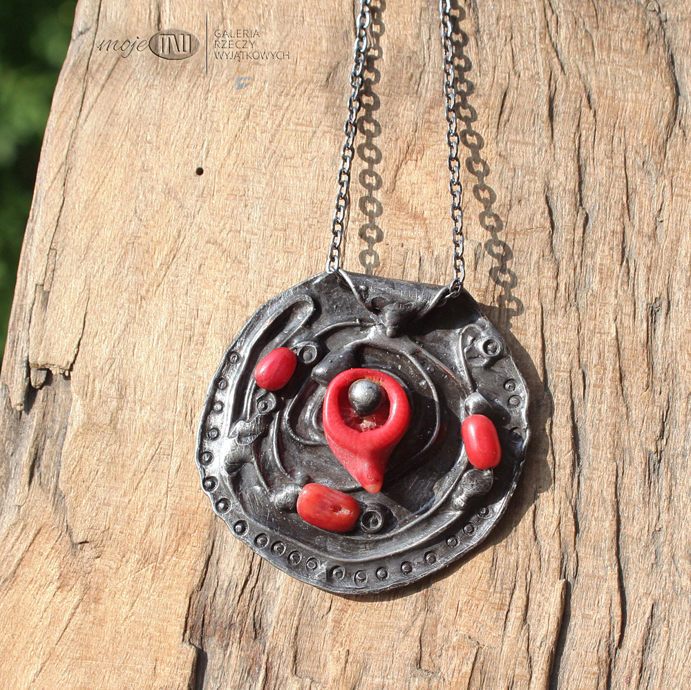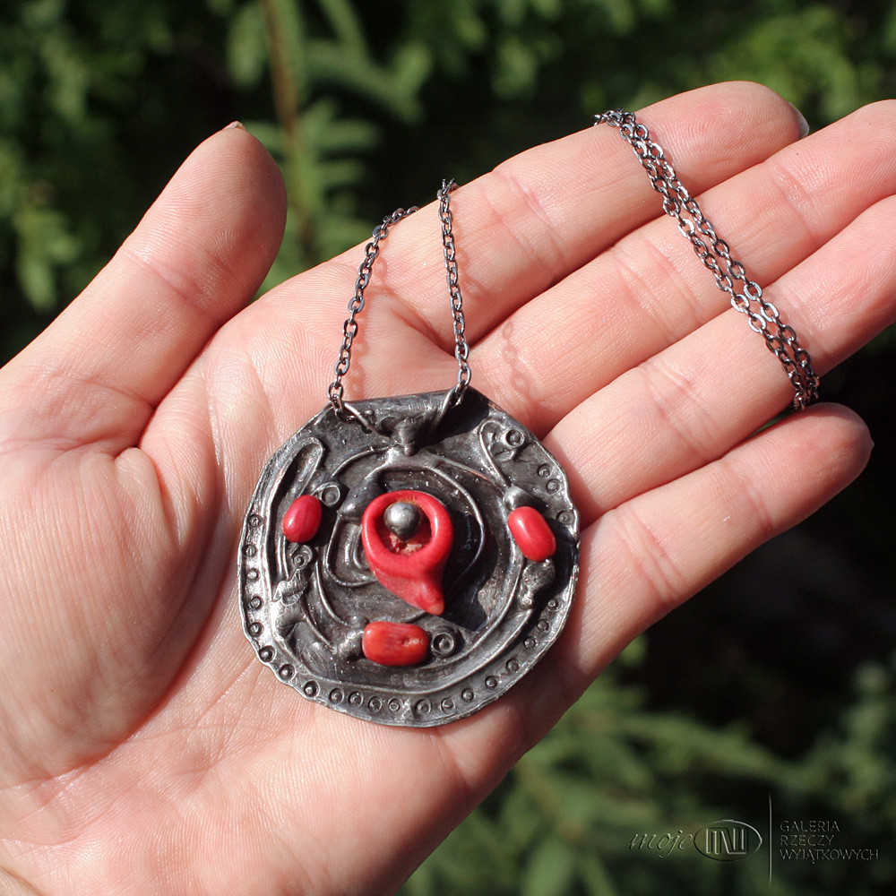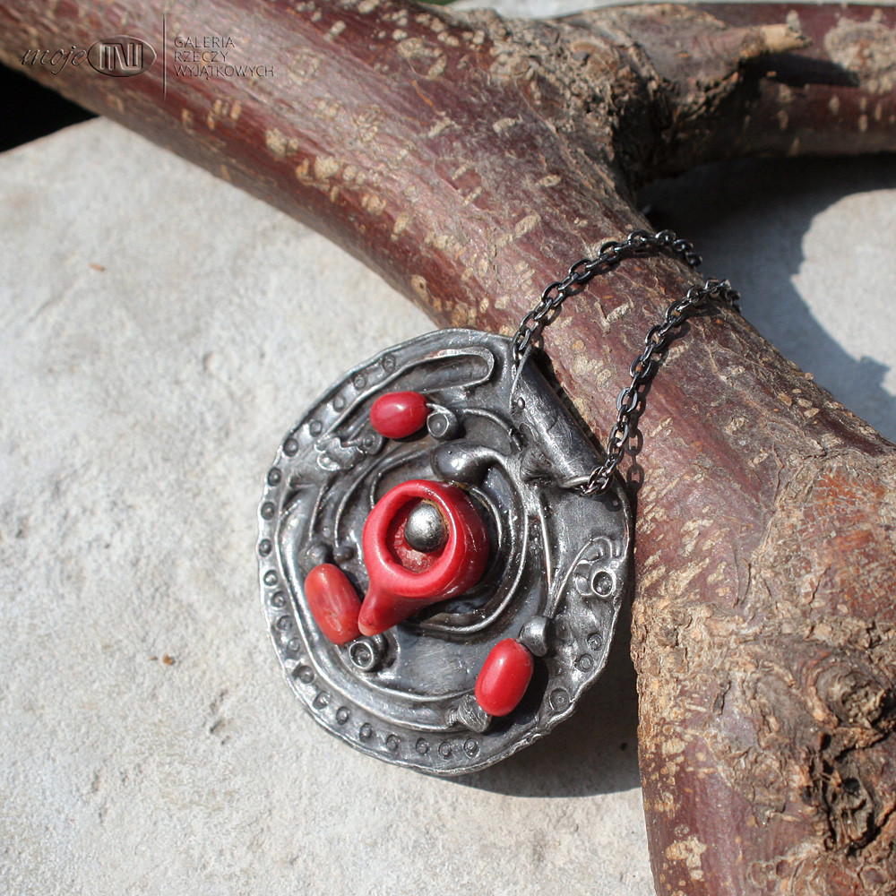 Wisior z miedzi pokrytej cyną i czerwonego korala.