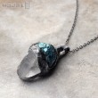 Prosty w formie naszyjnik z surowymi bryłami kryształu górskiego - przejrzystego oraz opalizującego metalicznie. Kamienie są połączone i oprawione minimalistycznie w cynowaną, patynowaną i przecieraną miedź. Wisior jest zawieszony na łańcuszku w kolorze grafitowym.