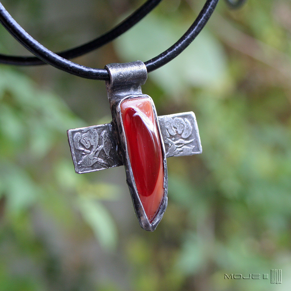 Wisior w kształcie krzyża ze szkła i trawionej miedzi. Centralną oś stanowi szklany kaboszon, który wytopiłam metodą fusingu z bordowego i czerwonego szkła. Oprawa i ramiona boczne są z miedzi - cynowanej, patynowanej i przecieranej.
