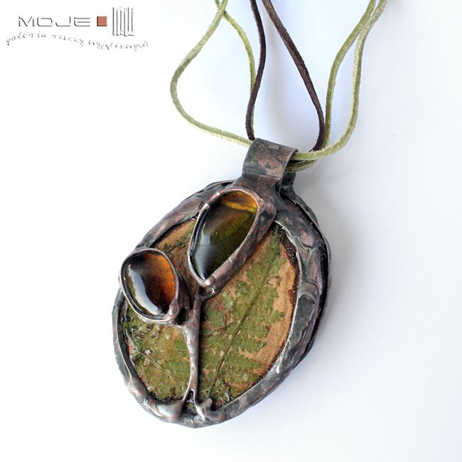 Szkło i drewno oprawione jest w miedź - cynowaną, patynowaną i przecieraną. Medalion zawieszony jest na rzemykach.