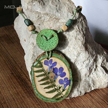 Ręcznie cięty plaster drewna, suszony liść paproci, suszone kwiaty lobelii, drewniane koraliki, sznurek woskowany w kolorze zielonym. Powiew lata w środku zimy...