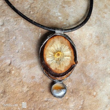 Bejcowany i lakierowany bezbarwnie plaster orzechowego drewna z suszoną stokrotką ozdobiony jest kaboszonem w kolorze biało-żółtym, który wytopiłam metodą fusingu w temperaturze min. 800 stopni.