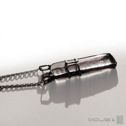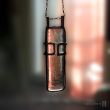 Duży wisior z bezbarwnego szkła, wytopiony przeze mnie metodą fusingu. Oprawiony jest w miedź - cynowaną, patynowaną i przecieraną. Zawieszony na łańcuszku o prostokątnych oczkach ze stali chirurgicznej.
