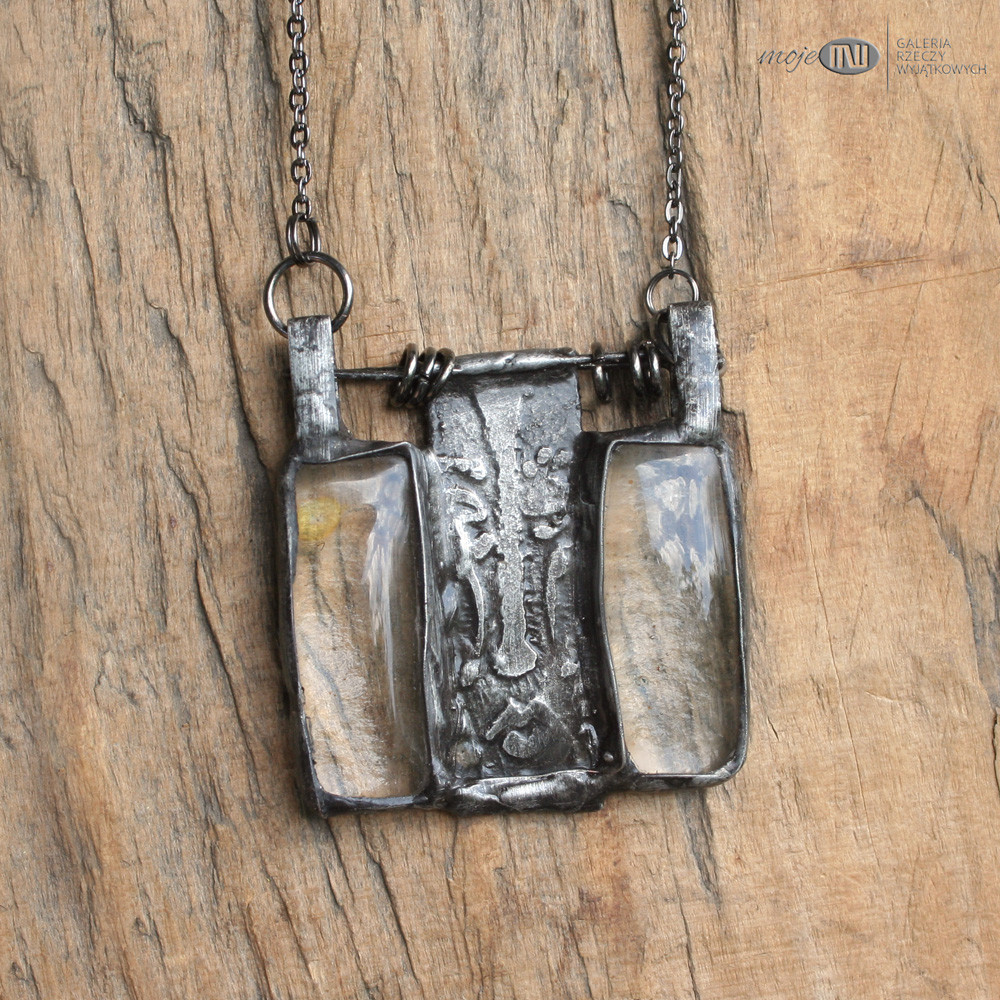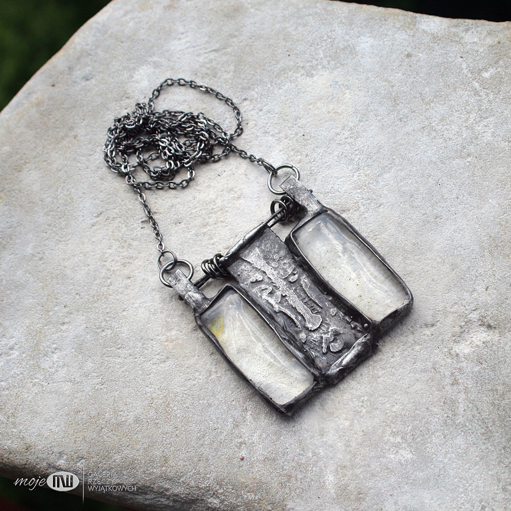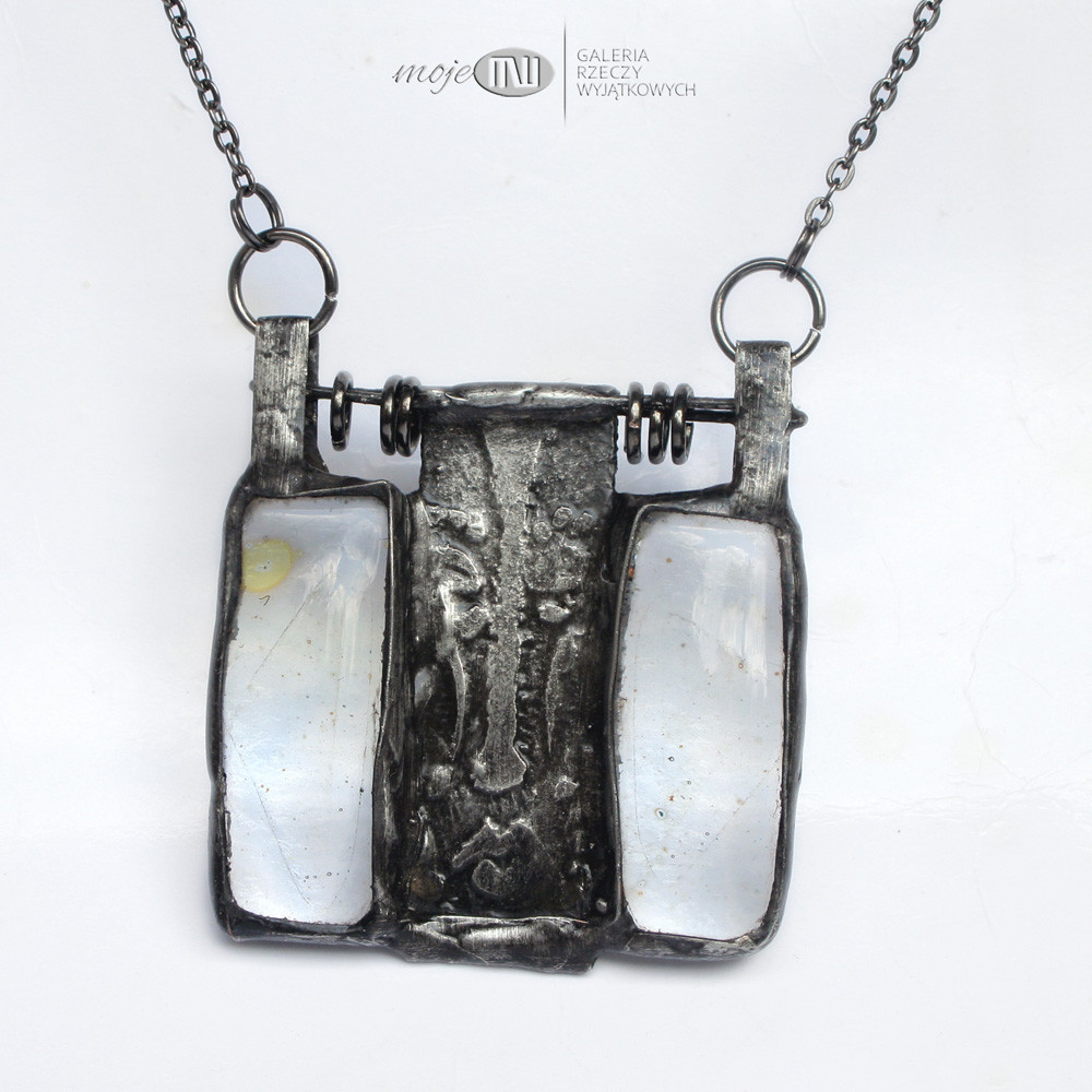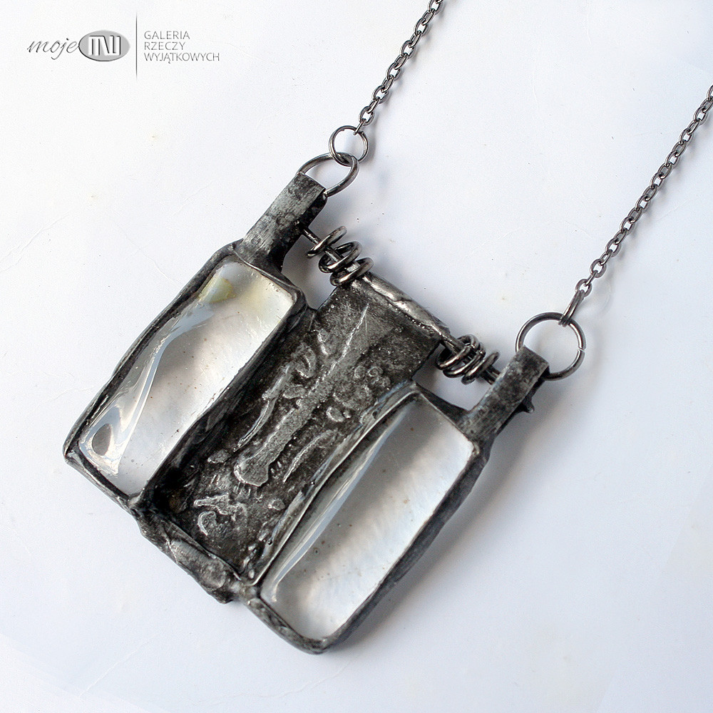 Wisior zrobiony z dwóch tafli bezbarwnego, topionego szkła i miedzi, w której wytrawiłam stylizowaną, nieco uproszczoną twarz. Miedź pokryta jest cyną, patynowana na kolor starego srebra i przecierana dla wydobycia rysunku.