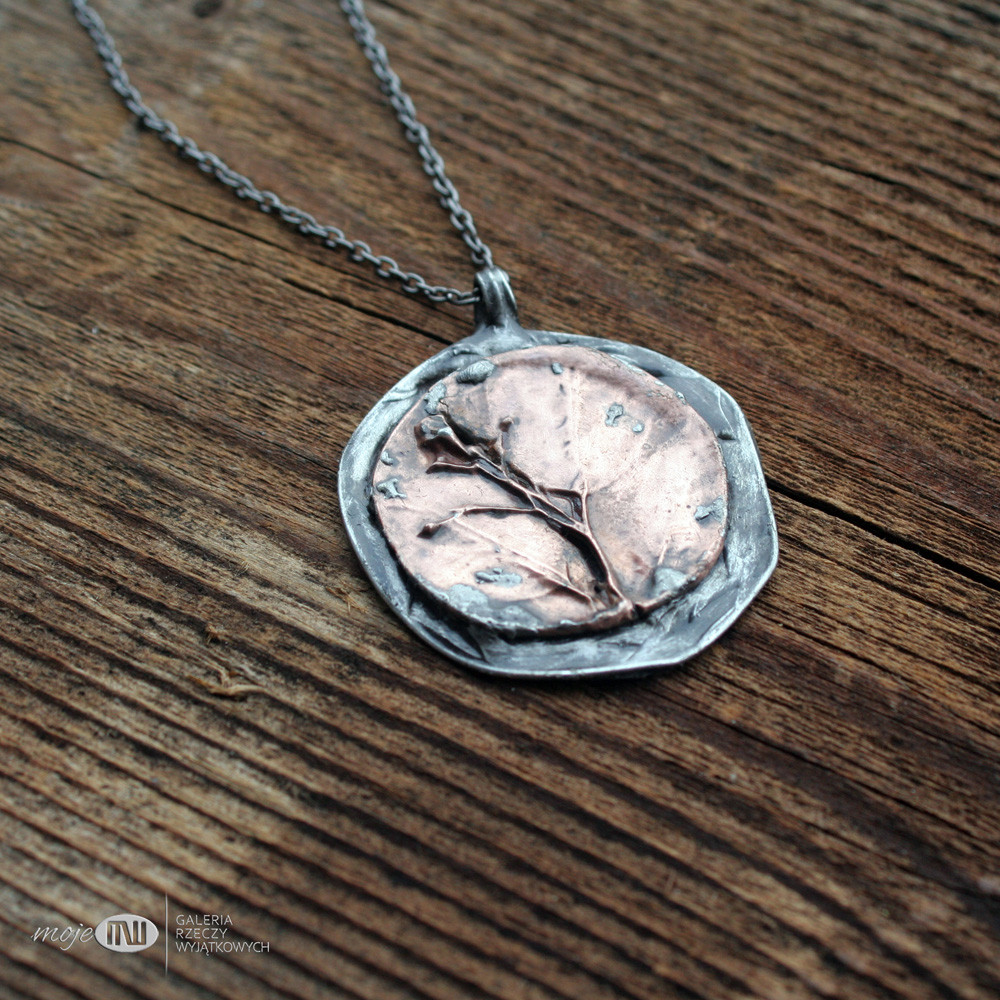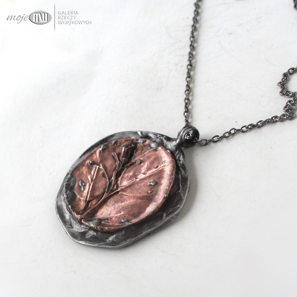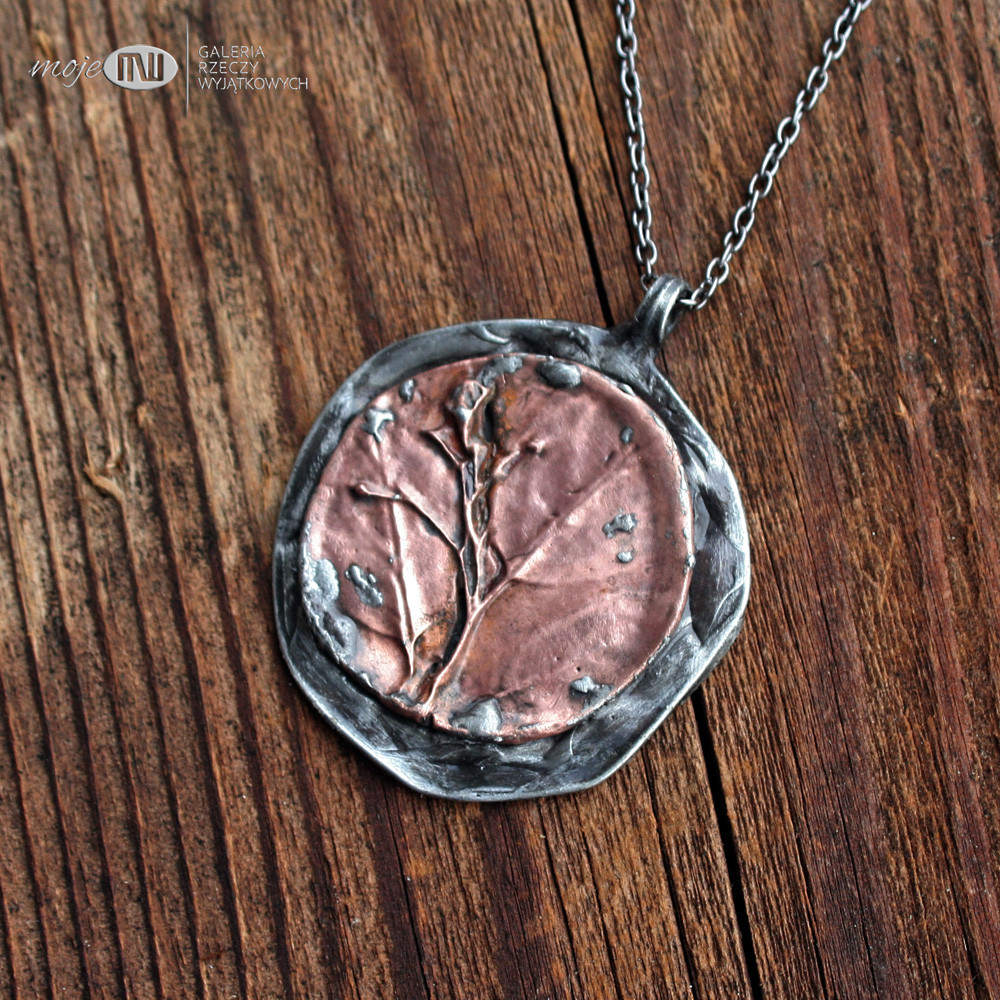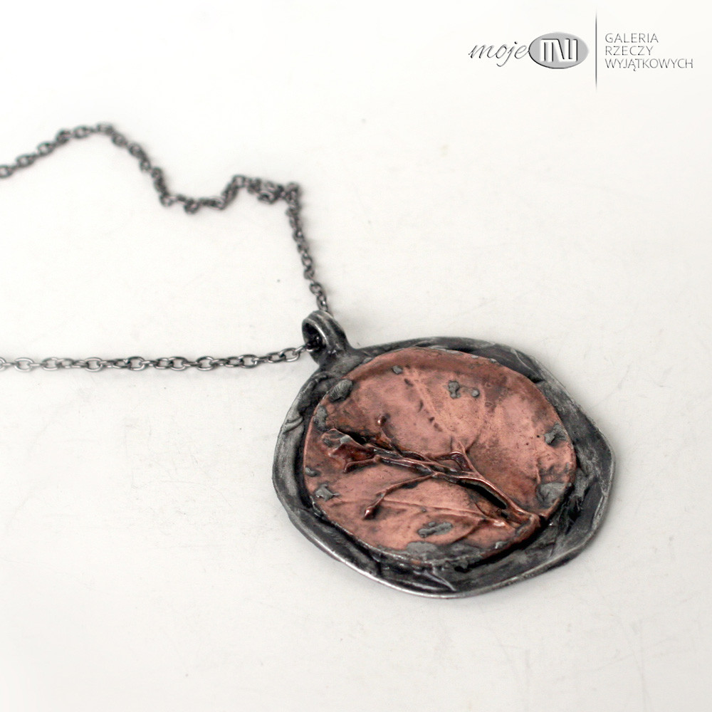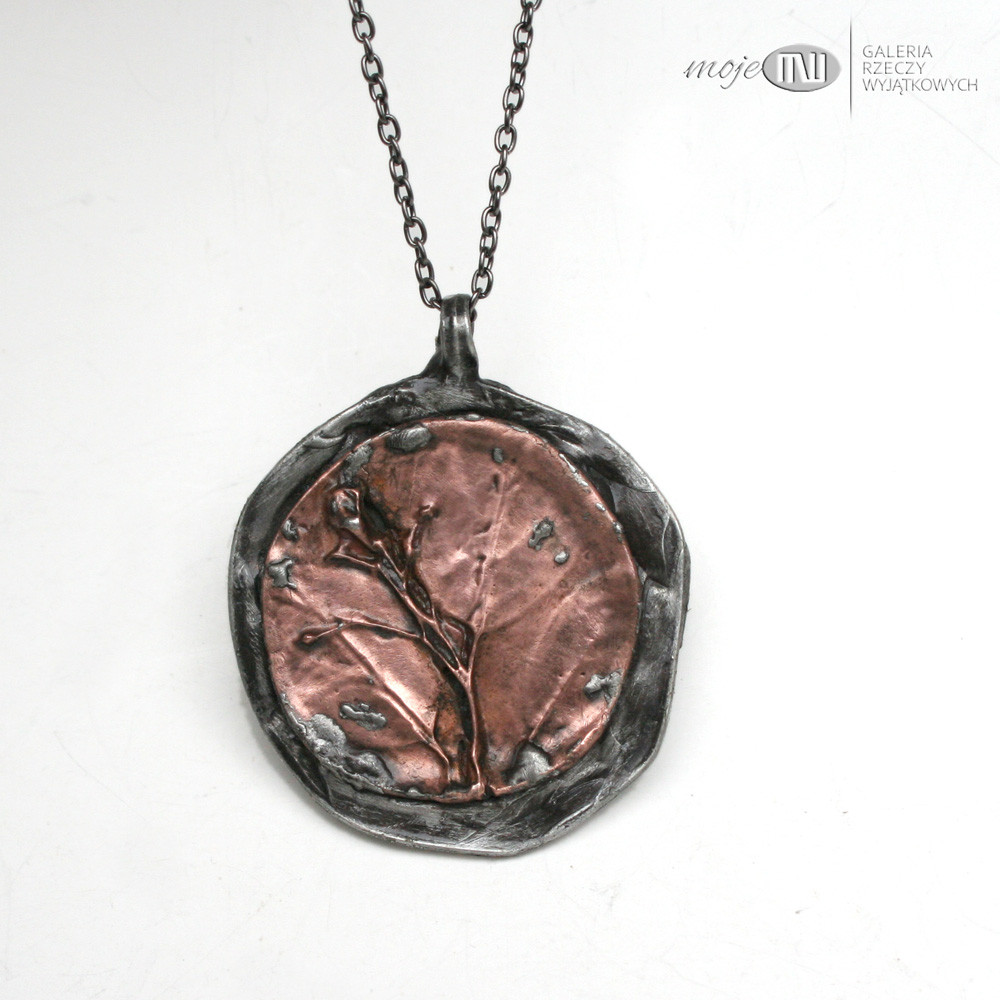 Wisior z wizerunkiem polej roślinki z ręcznie formowanej miedzianej glinki, którą potem wypaliłam w temperaturze 970 stopni C. Ozdobny element został umieszczony na miedzianej blasze pokrytej cyną, patynowanej i przecieranej dla wydobycia drobnych detali. Wisior zawieszony jest na łańcuszku w kolorze grafitowym - zazwyczaj dodaję łańcuszek o długości ok. 60-70 cm, ale klient może podać długość, która go interesuje.
