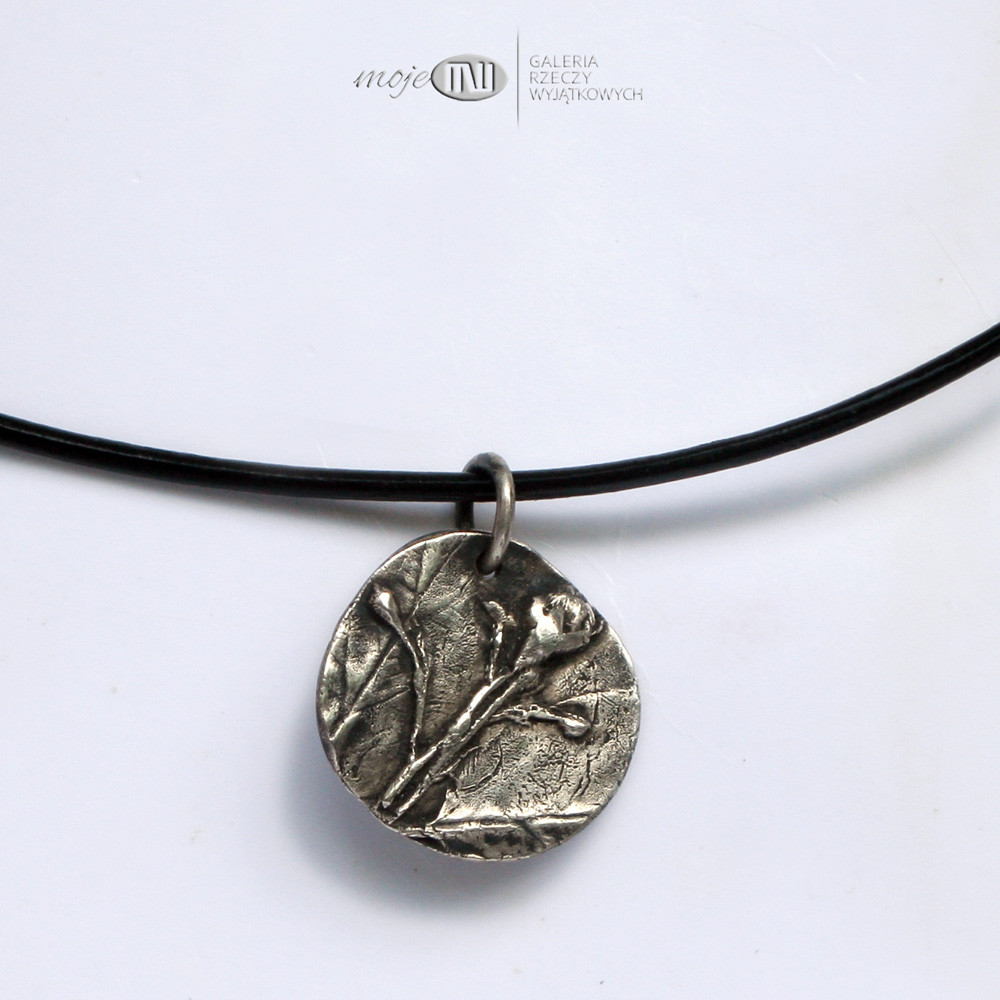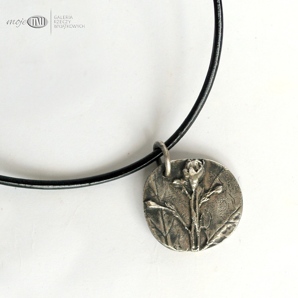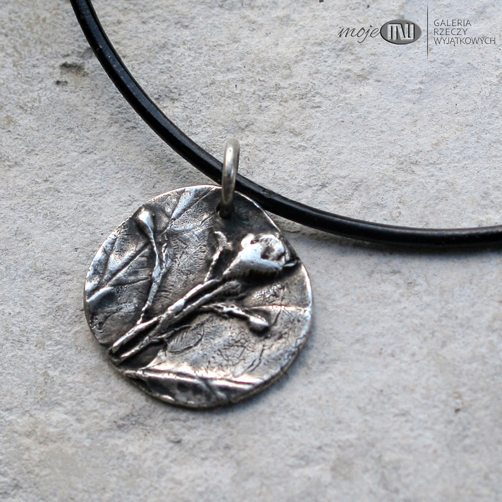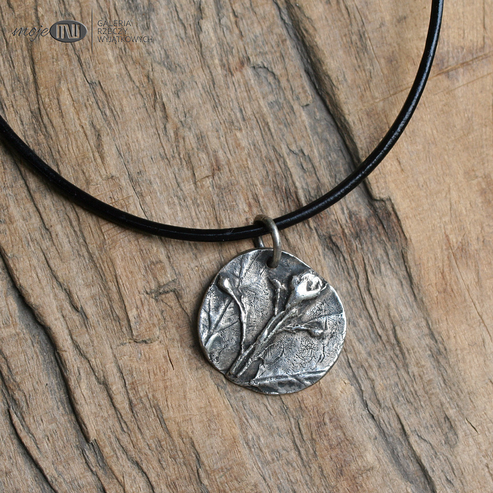 Niewielki wisiorek z ręcznie formowanego srebra z realistycznym wizerunkiem polnej roślinki. Zawieszony jest na czarnym skórzanym rzemyku o gr. 2 mm. Zakończenia rzemienia i zapięcie są ze stali chirurgicznej.