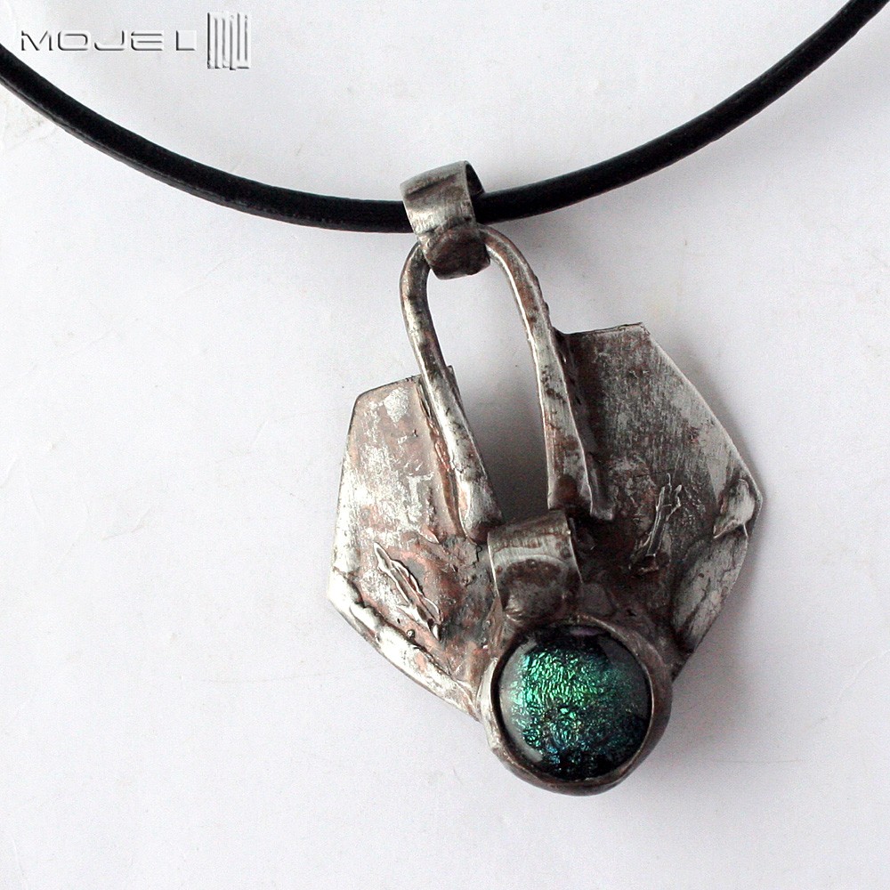 Wisior z pokrytej cyną miedzi i kaboszona wytopionego z dichroicznego szkła. Jest rustykalny i surowy.