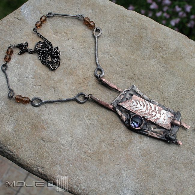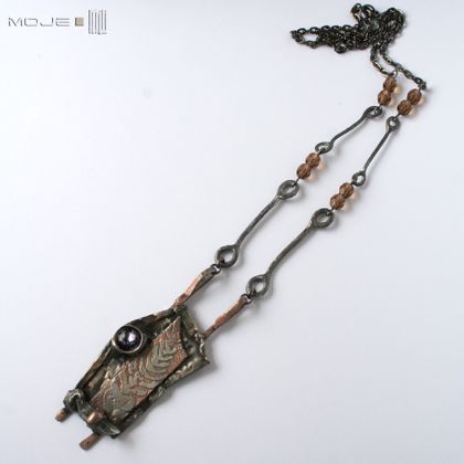 Piękny i niepokojący wisior z miedzi, niewielkiego kryształu górskiego i szklanego oczka, które wytopiłam metodą fusingu ze szkła dichroicznego. Głównym motywem jest trawiony wzór, w którym ktoś może dojrzeć np rybi szkielet, a ktoś inny liść paproci... Szklany kaboszon opalizuje delikatnie fioletem i morską zielenią.