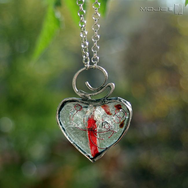 Serce wytopiłam głównie z bezbarwnego szkła metodą fusingu (wypalanie szkła w temp. 800 stopni). Oprawione jest techniką Tiffany w cynowaną, patynowaną i przecieraną miedź. Zawieszone na łańcuszku w kolorze srebrnym.