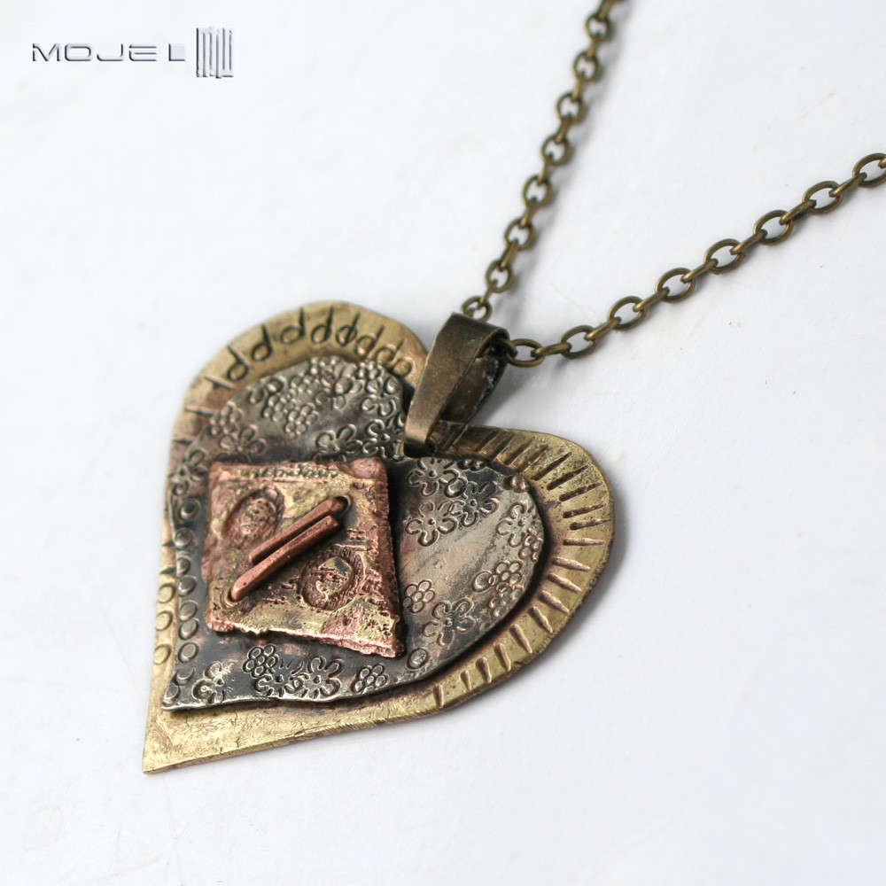 Wisior w kształcie serca z trzech rodzajów blachy - miedzi, alpaki i mosiądzu. Ozdobione jest drobnymi tłoczonymi kwiatuszkami, częściowo młotkowane, patynowane i przetarte dla wydobycia faktury.