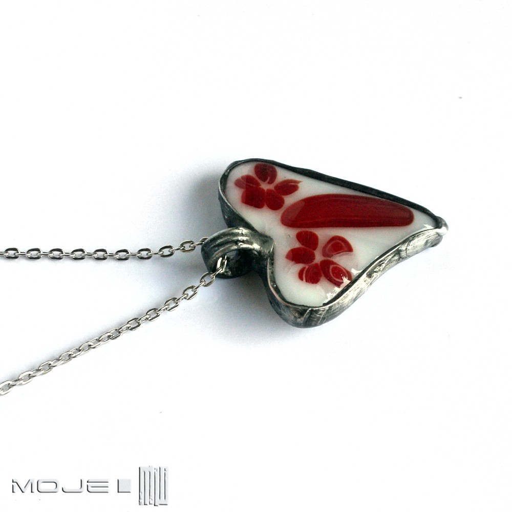Serce wytopiłam metodą fusingu z białego i czerwonego szkła. Oprawione jest techniką Tiffany w cynowaną, patynowaną i przecieraną miedź. Zawieszone na łańcuszku w kolorze srebrnym.