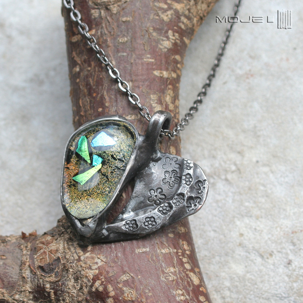 Wisior ze szkła i miedzi w kształcie serca. Szkło dichroiczne delikatnie opalizuje w świetle. Kształty nie są idealne i to jest cały urok tego wisiorka.Miedź pokryta jest cyną, patynowaną i przecieraną dla uzyskania efektu postarzenia. Dodatkowo lekkości dodają małe kwiatuszki. Wisiorek zawieszony jest na łańcuszku w kolorze grafitowym.