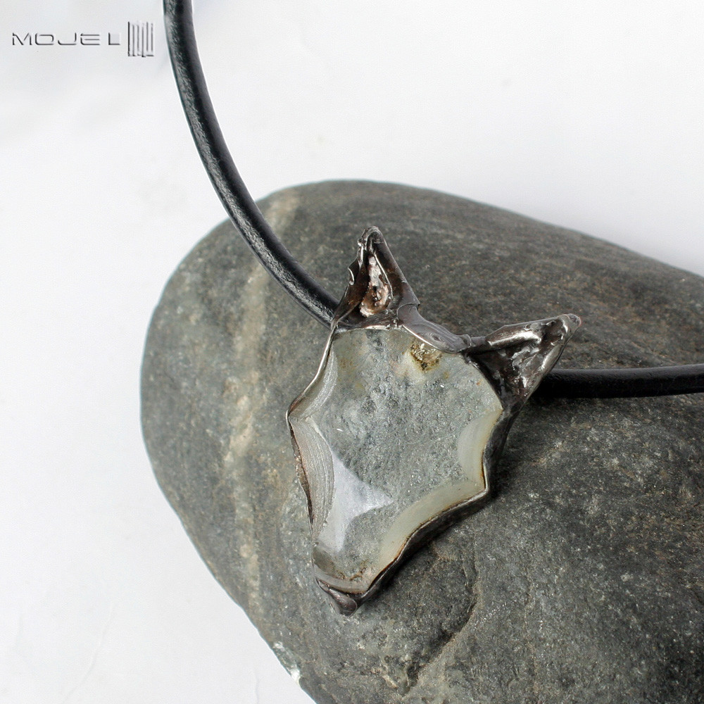 Wisior ze stylizowaną i dość uproszczoną głową wilka. Wytopiona jest z bezbarwnego szkła, szlifowana i miejscami lekko matowiona, oprawiona prosto w miedź pokrytą cyną i patynowaną na staro. Wisior jest zawieszony na czarnym skórzanym rzemieniu o gr. 4 mm