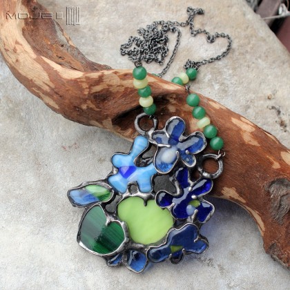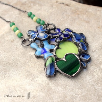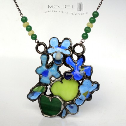 Kwiatowy wisior zrobiony z niebieskiego, błękitnego i szafirowego szkła - metodą fusingu wytopiłam kwiaty fiołków. Szkło jest mleczne i przejrzyste. Kwiatki oprawione są w miedź - pokrytą cyną, patynowaną i przecieraną.