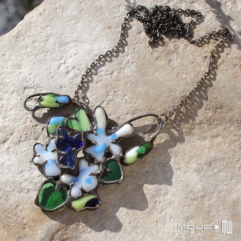Kwiatowy wisior z białego i niebieskiego szkła. Metodą fusingu wytopiłam kwiaty fiołków. Kwiatki dostały potem kilka liści i łodyżek, oprawiłam je w miedź - pokrytą cyną, patynowaną i przecieraną. Wisior/naszyjnik jest dość duży, zawieszony na łańcuszku w kolorze grafitowym.