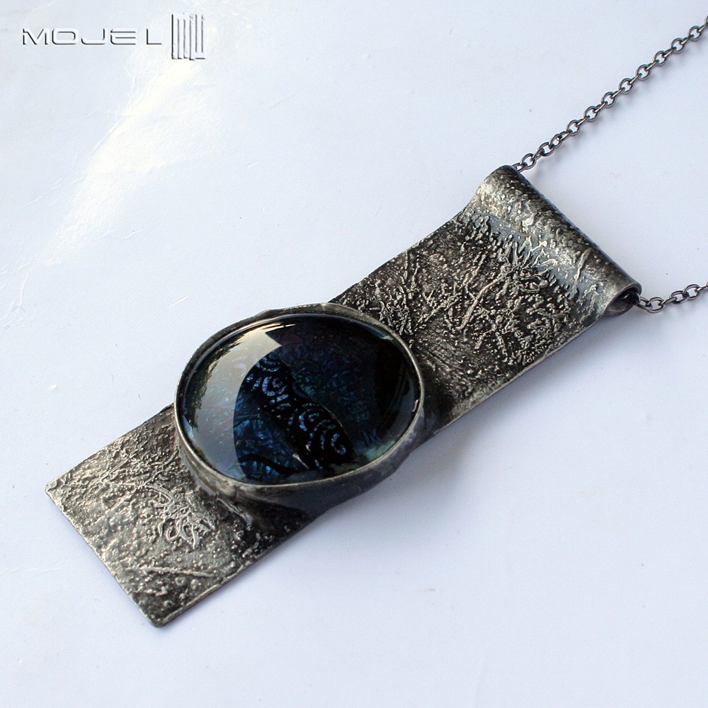Ozdobą jest szklane oko wykonane przeze mnie ze szkła dichroicznego metodą fusingu, czyli wypalania szkła w wysokiej temperaturze. Oko jest w kolorach czarno-lazurowo-morskich, bardzo stonowanych, w słońcu delikatnie połyskuje ujawniając całą swoją elegancję i urodę.