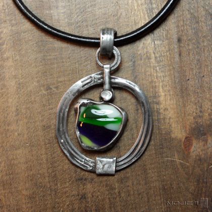 Wisior w odrobinie celtycki w formie. Centralną częścią jest szklany kaboszon wytopiony przeze mnie, oprawiony i wykończony miedzią - cynowaną, patynowaną i przecieraną. Wisior zawieszony jest na czarnym skórzanym rzemieniu o gr. 4 mm i dł. ok 50 cm.