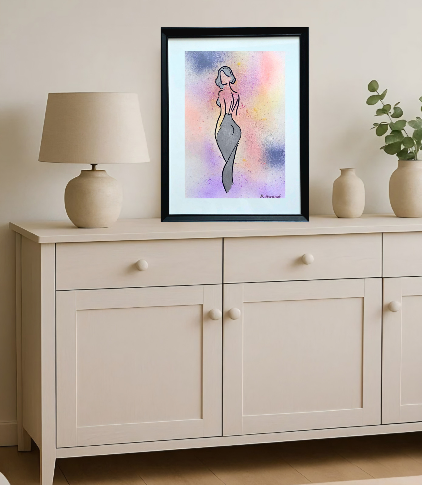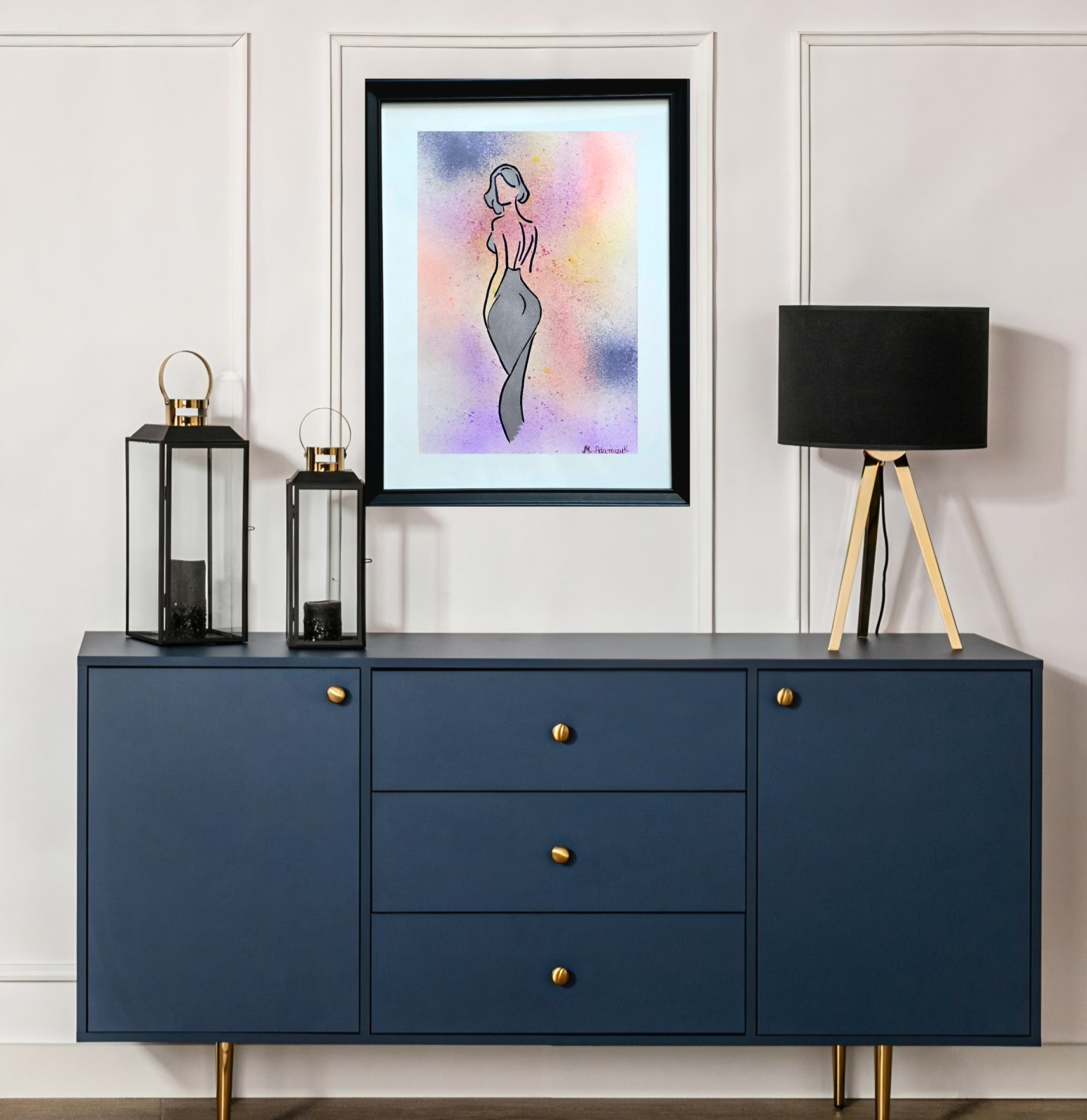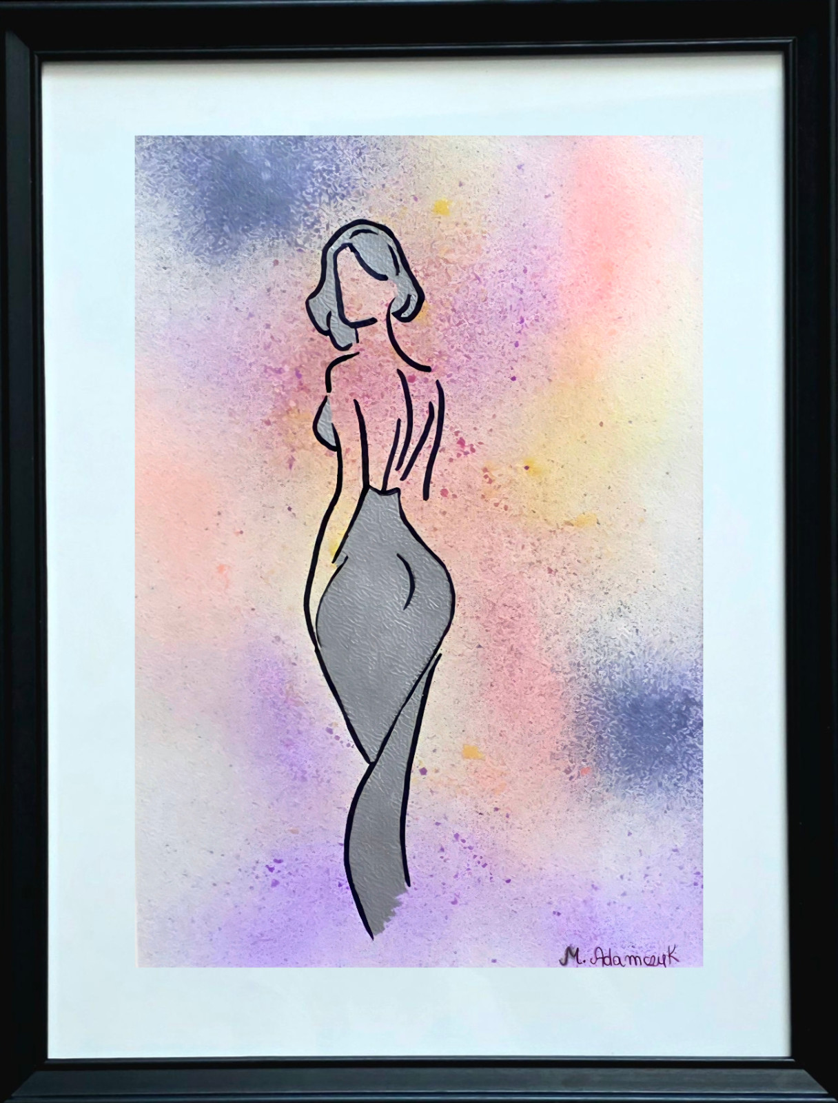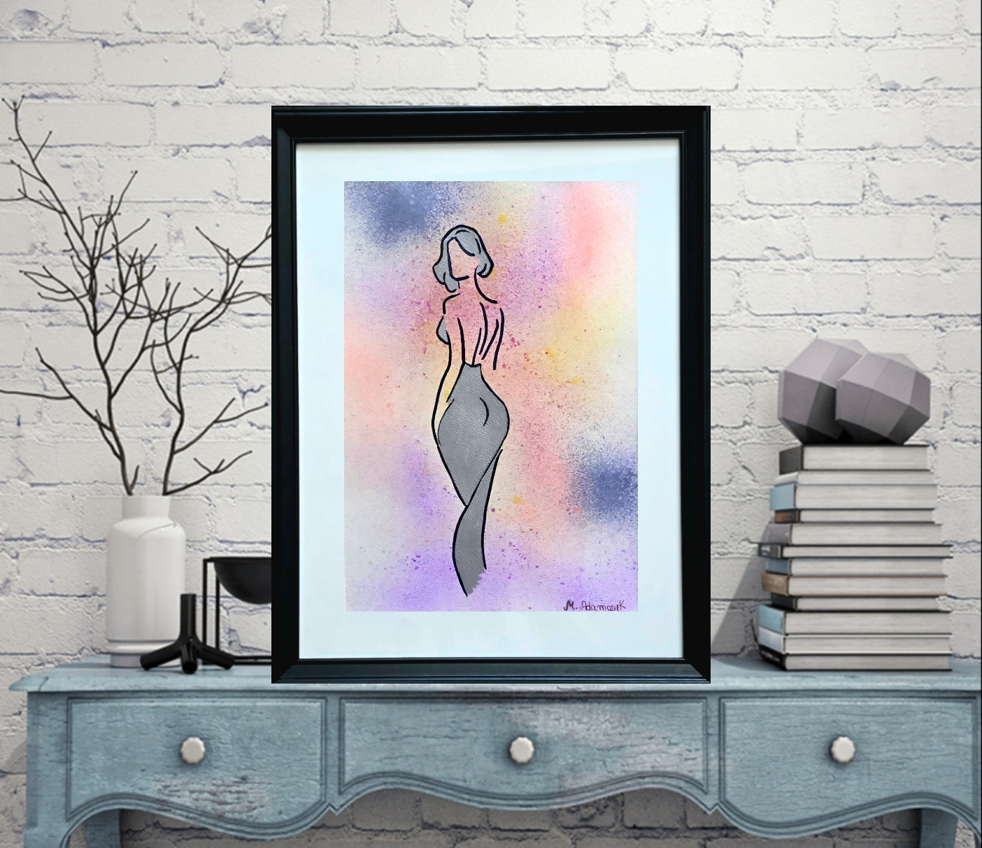 Obraz line art, wykonany srebrnym cienkopisem oraz farbami akrylowymi na papierze o wysokiej gramaturze. Sprzedawany w ramce jak na zdjęciu. Wymiary ramy: 40x30.