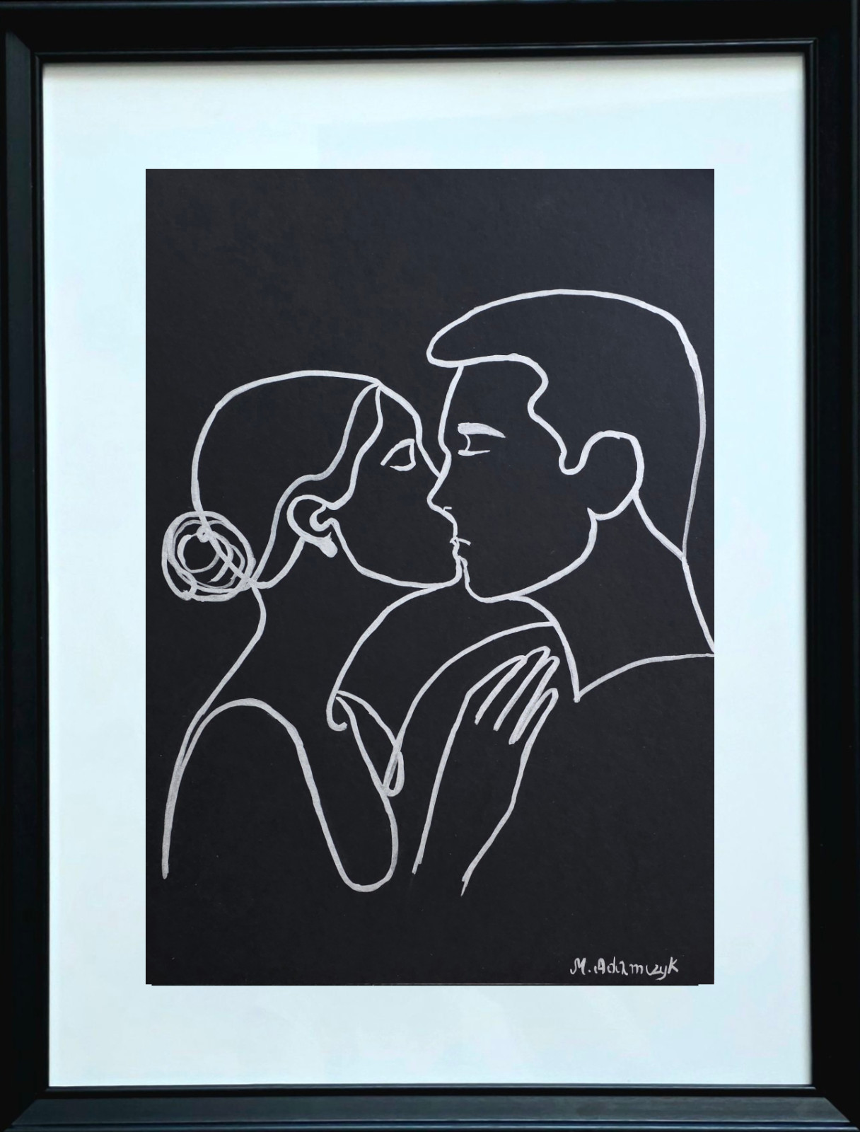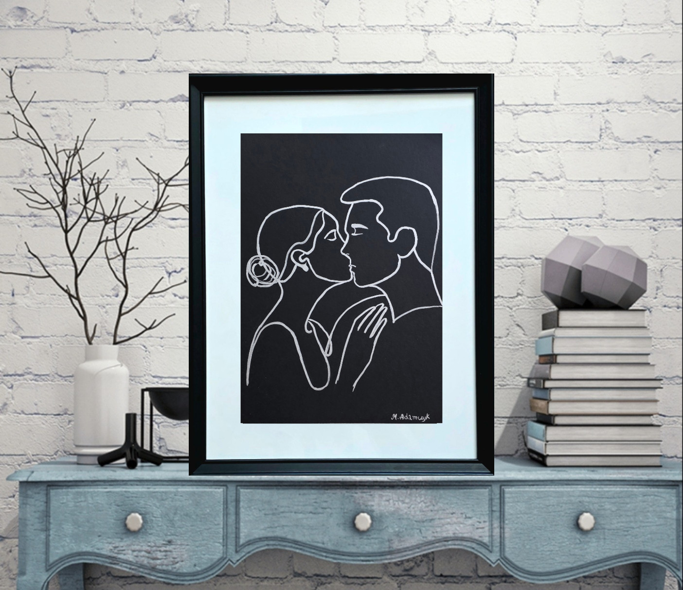 Rysunek line art, wykonany srebrnym cienkopisem na papierze o wysokiej gramaturze. Sprzedawany w ramce jak na zdjęciu. Wymiary ramy: 40x30.
