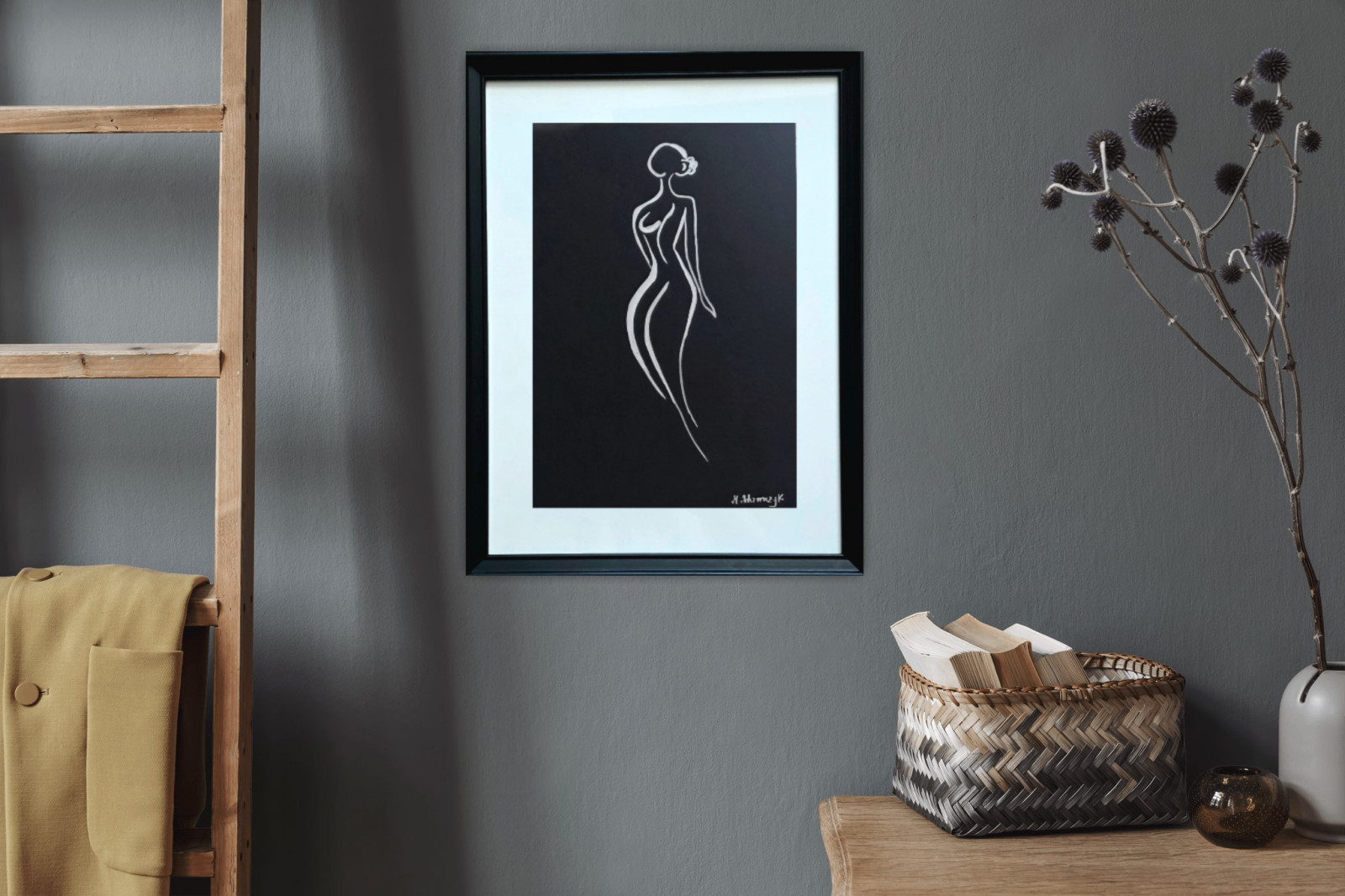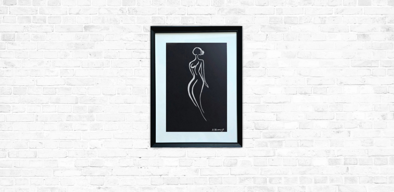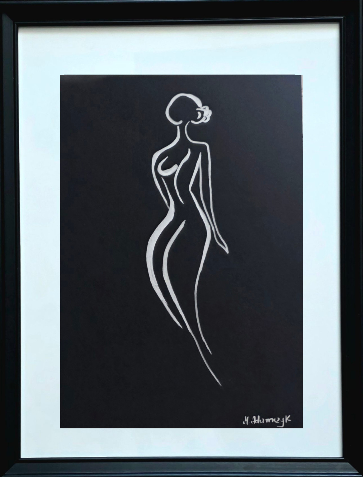 Rysunek line art, wykonany srebrnym cienkopisem na papierze o wysokiej gramaturze. Sprzedawany w ramce jak na zdjęciu. Wymiary ramy: 40x30.
