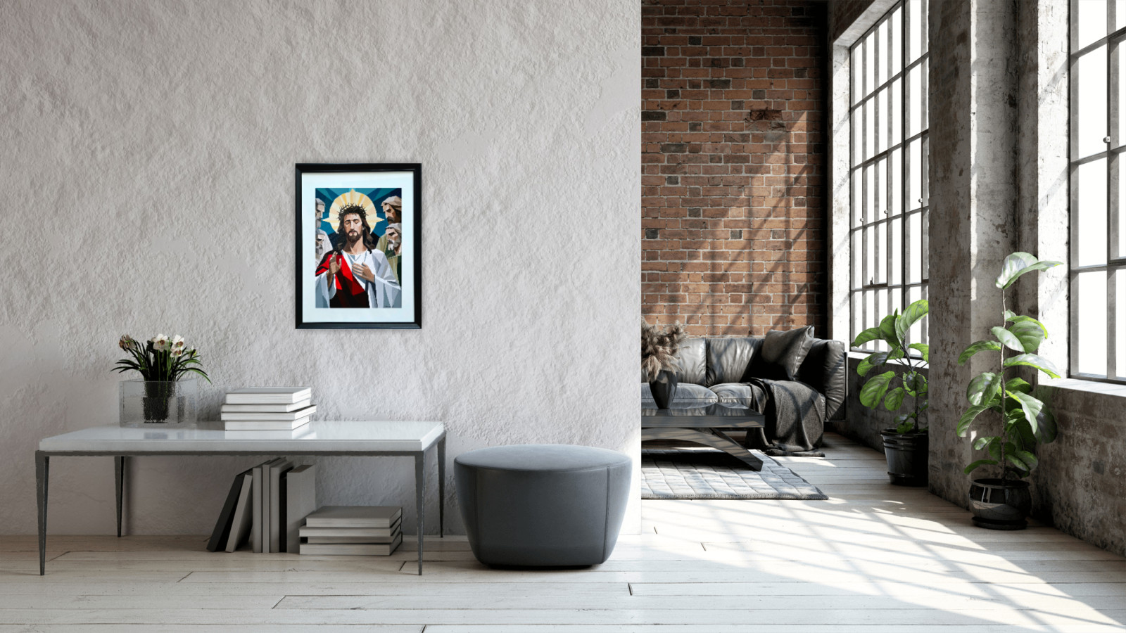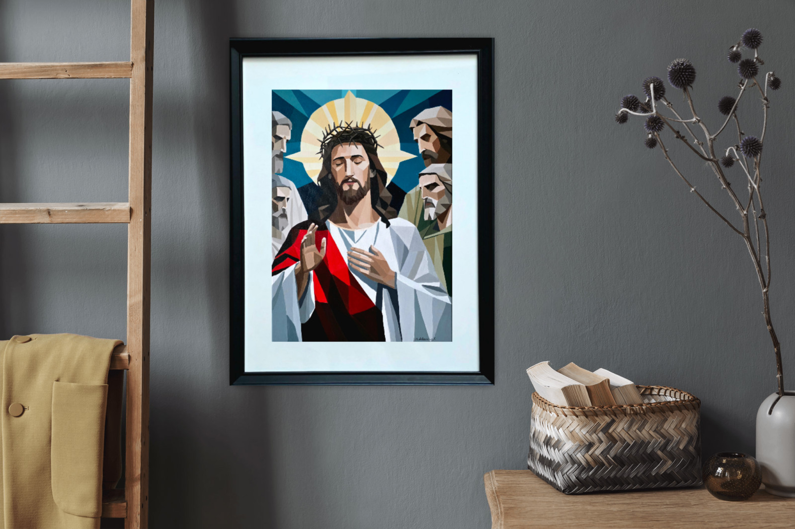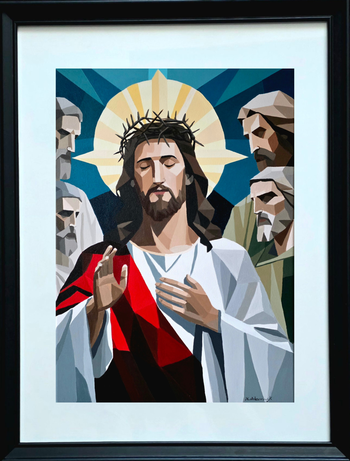 Wydruk ma format A4 i jest oprawiony w ramę z passe-partout o wymiarach 40 × 30 cm, co nadaje pracy elegancki, galeryjny charakter i sprawia, że jest gotowa do ekspozycji.