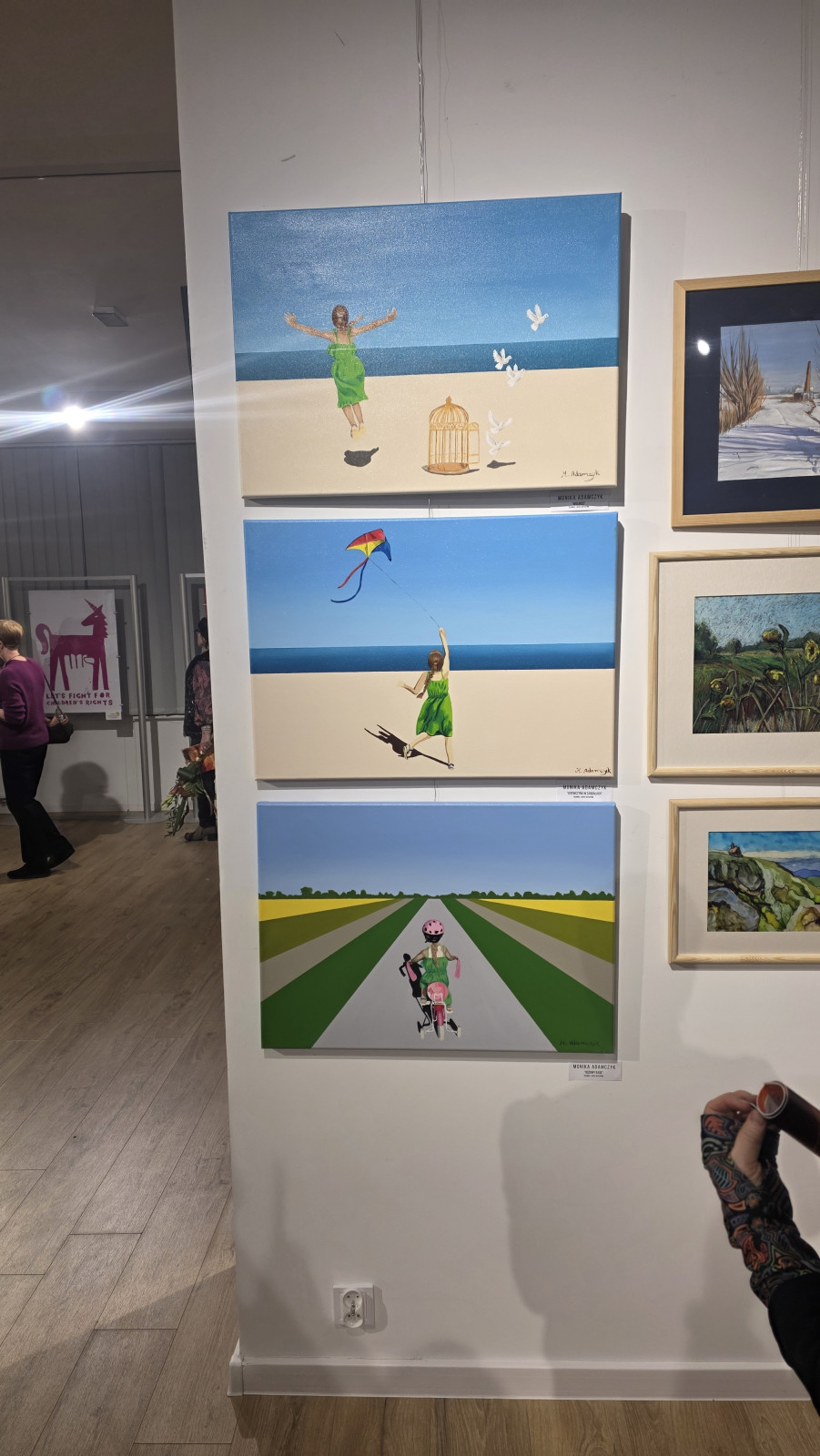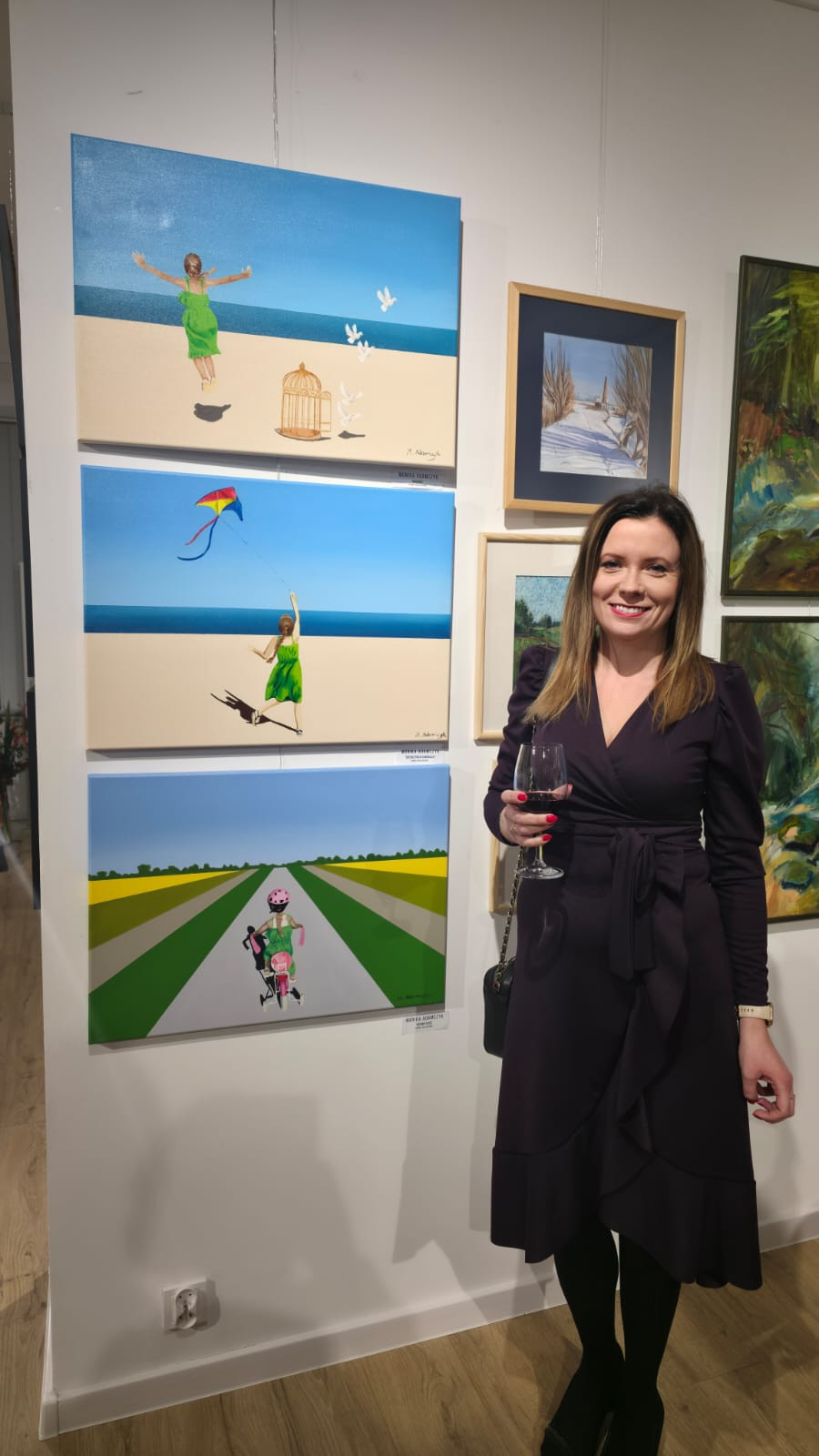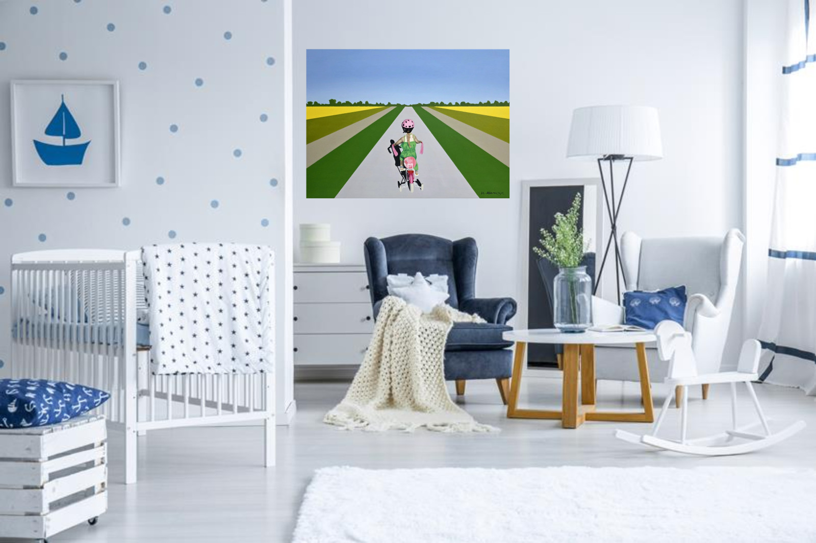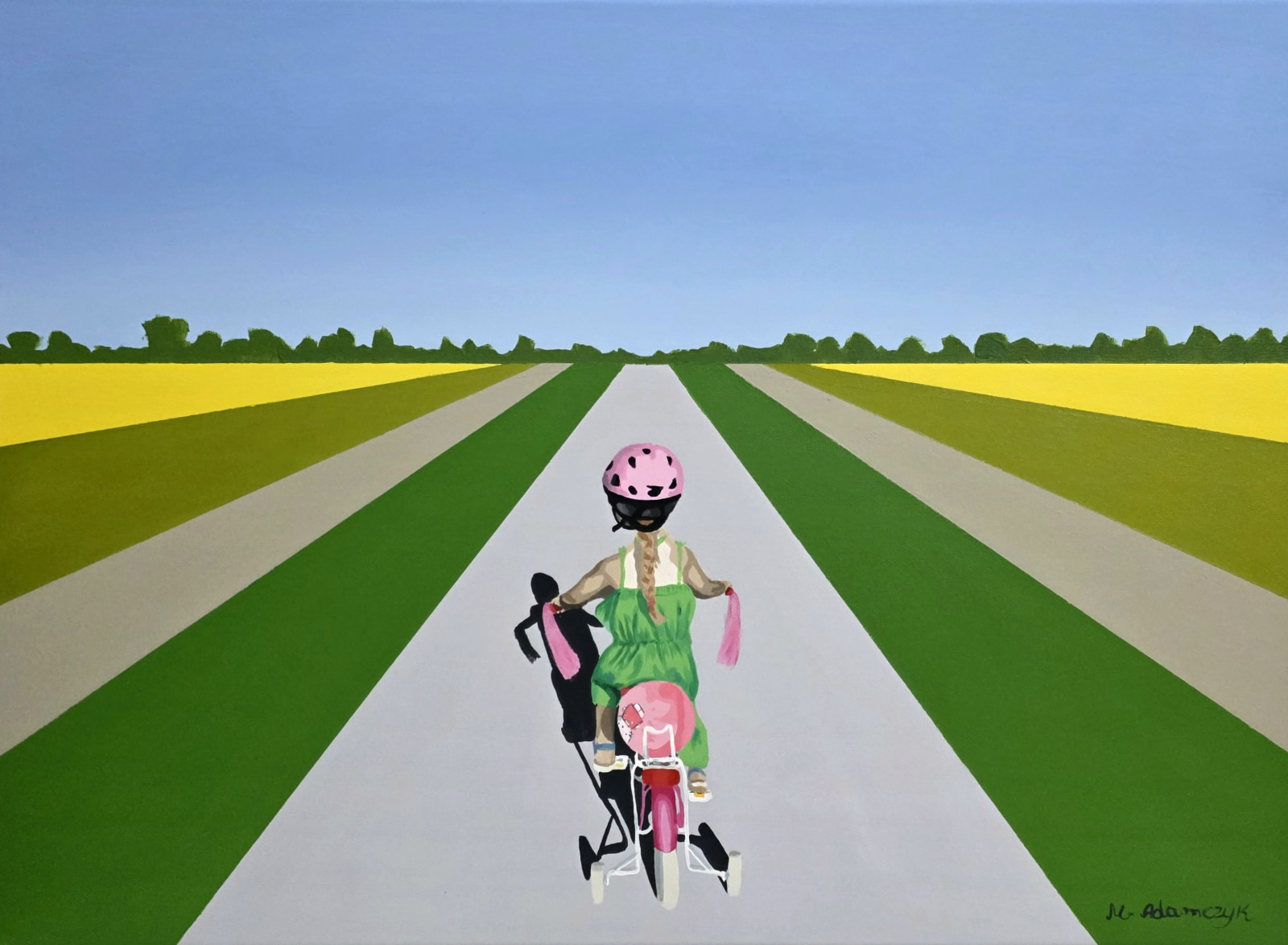 Kompozycja przedstawia dziewczynkę jadącą rowerem po długiej, prostej drodze wśród pól. Centralna perspektywa i rytm pasów krajobrazu prowadzą wzrok w głąb obrazu, budując poczucie ruchu, drogi i dziecięcej samodzielności. Intensywne zielenie i żółcie w połączeniu z pastelowym niebem nadają pracy świeżość i lekkość, a motyw podróży może być odczytywany symbolicznie – jako początek, wolność i odwaga.