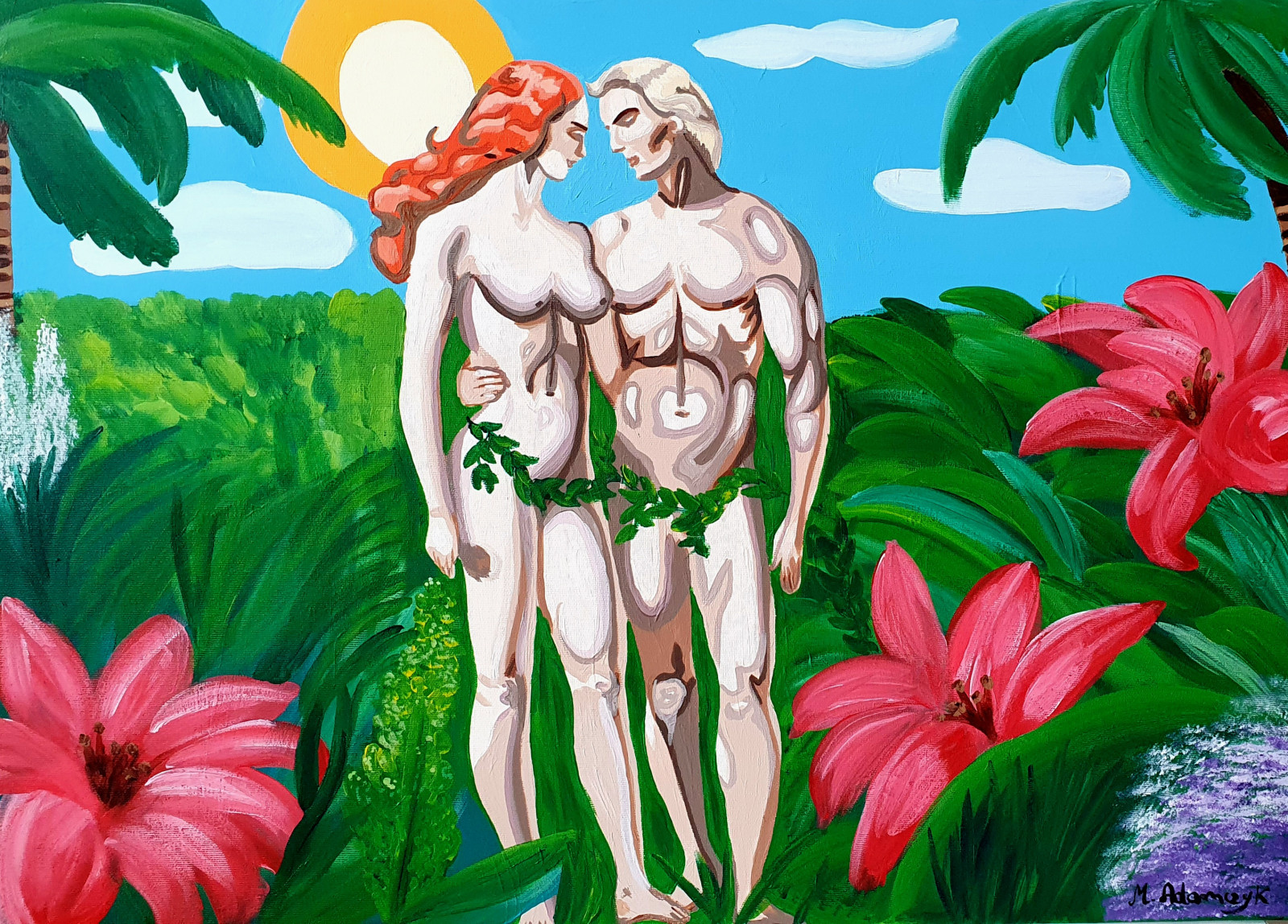 Tło wypełnia bujna, intensywnie zielona roślinność, palmy oraz duże, dekoracyjne kwiaty w odcieniach różu i czerwieni. Jasnoniebieskie niebo z białymi obłokami i słońcem wzmacnia wrażenie idyllicznego, pierwotnego świata. Całość utrzymana jest w żywej, nasyconej kolorystyce, typowej dla techniki akrylowej, z wyraźnym, ekspresyjnym śladem pędzla.