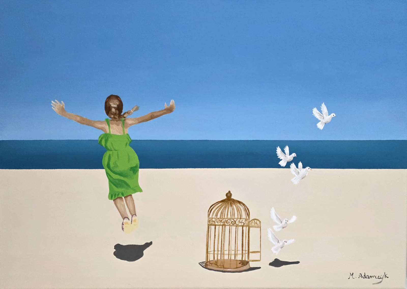 Kompozycja przedstawia symboliczną scenę nad morzem: unoszącą się w powietrzu postać dziewczynki, otwartą klatkę oraz wylatujące z niej białe ptaki. Obraz porusza temat wolności, lekkości i przekraczania ograniczeń, łącząc prostotę formy z mocnym, emocjonalnym przekazem. Minimalistyczne tło i kontrast barw sprawiają, że praca przyciąga uwagę i pozostaje w pamięci.