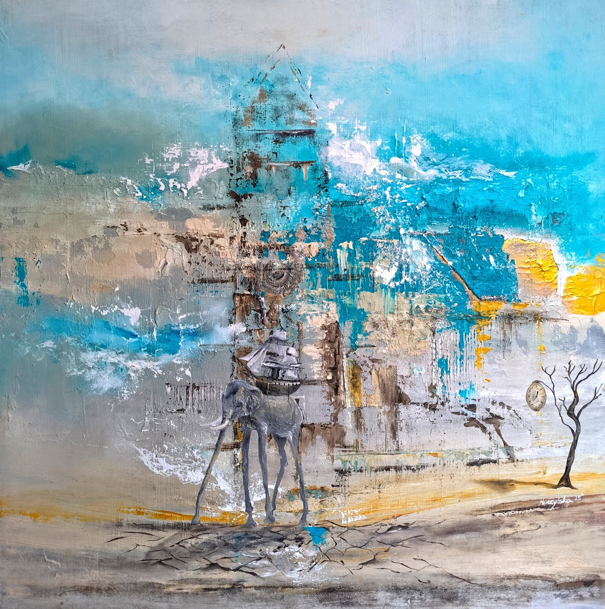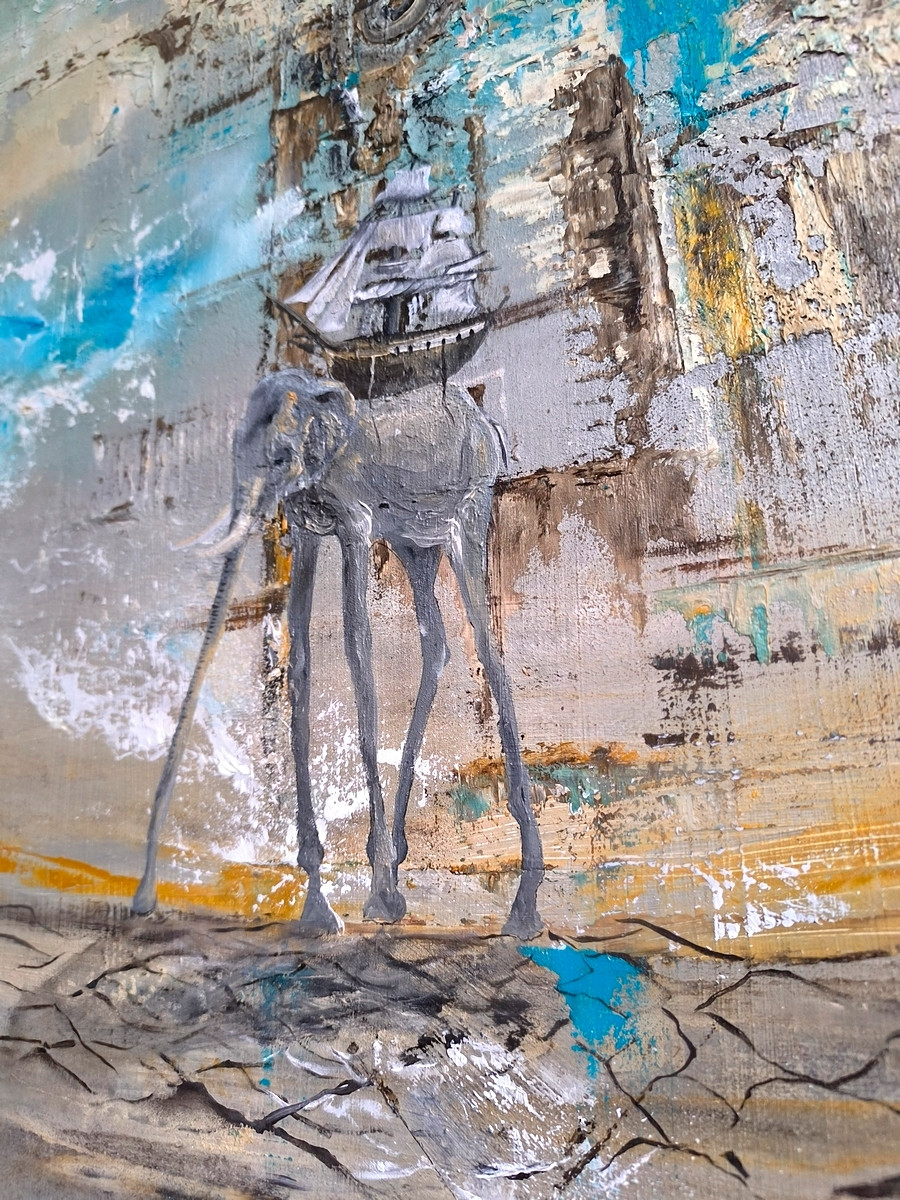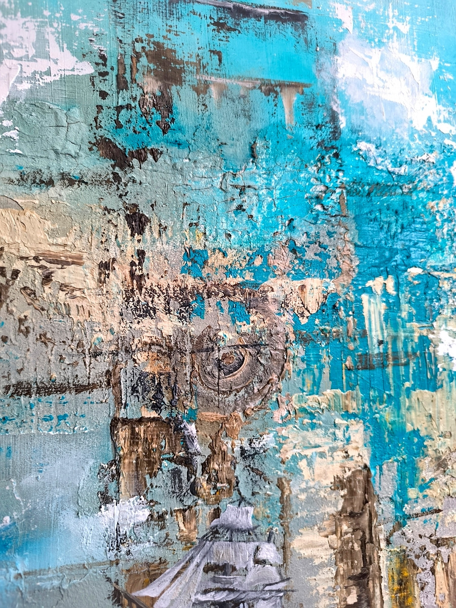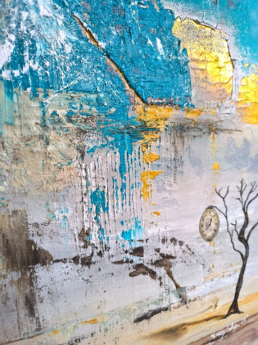 Rok produkcji 2025 r,. Obraz malowany szpachlą, pędzlem, technika własna, kolaż, boki malowane, pokryty werniksem