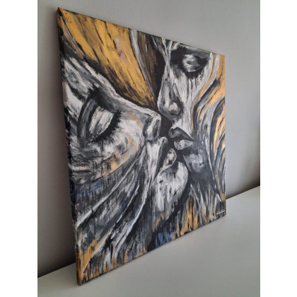 Obraz emanuje intensywnymi emocjami, przedstawiając twarze w chwili głębokiej bliskości. Artystyczna ekspresja wyrażona poprzez kontrast czerni, bieli i złotych akcentów nadaje kompozycji dramatyzmu oraz symbolicznej głębi. Dynamiczne pociągnięcia pędzla i surowa faktura podkreślają uczucia – namiętność, tęsknotę, zatracenie się w drugim człowieku. Abstrakcyjna forma i nieregularne linie sprawiają, że obraz wydaje się niemal pulsować energią. To opowieść o emocjach, które wymykają się słowom, a jednocześnie stają się niezwykle wyraziste w malarskiej interpretacji.