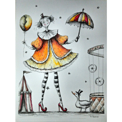 surrealizm, cyrk, klaun, gęś w kapeluszu, parasolka, balon, akwarela, cienkopis, groteska, marionetka