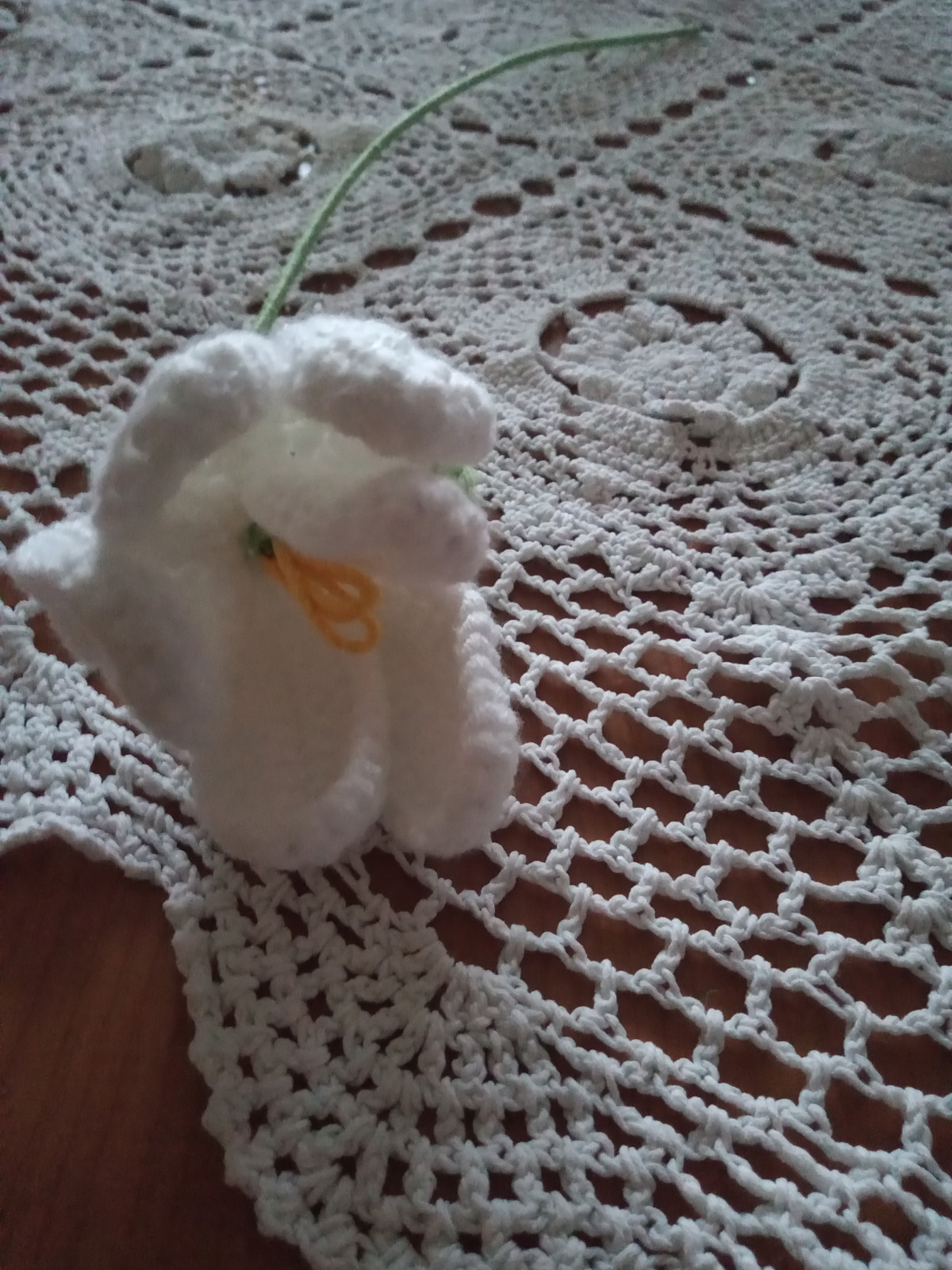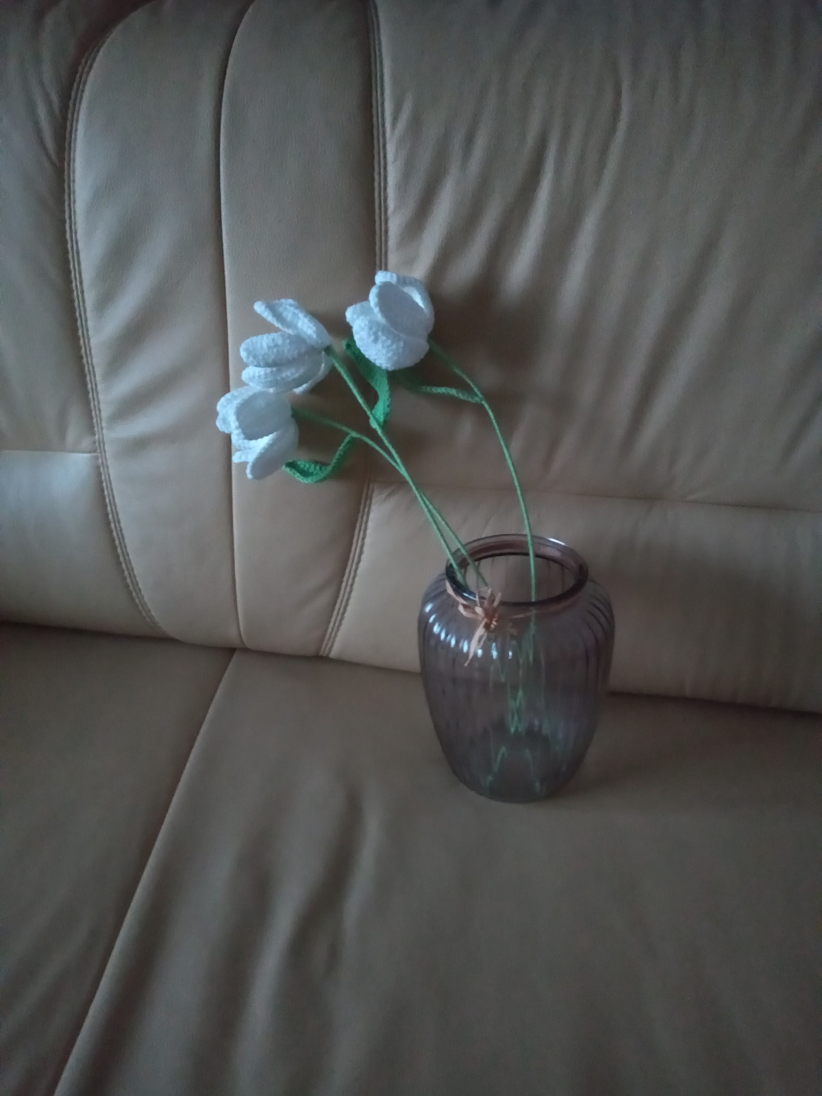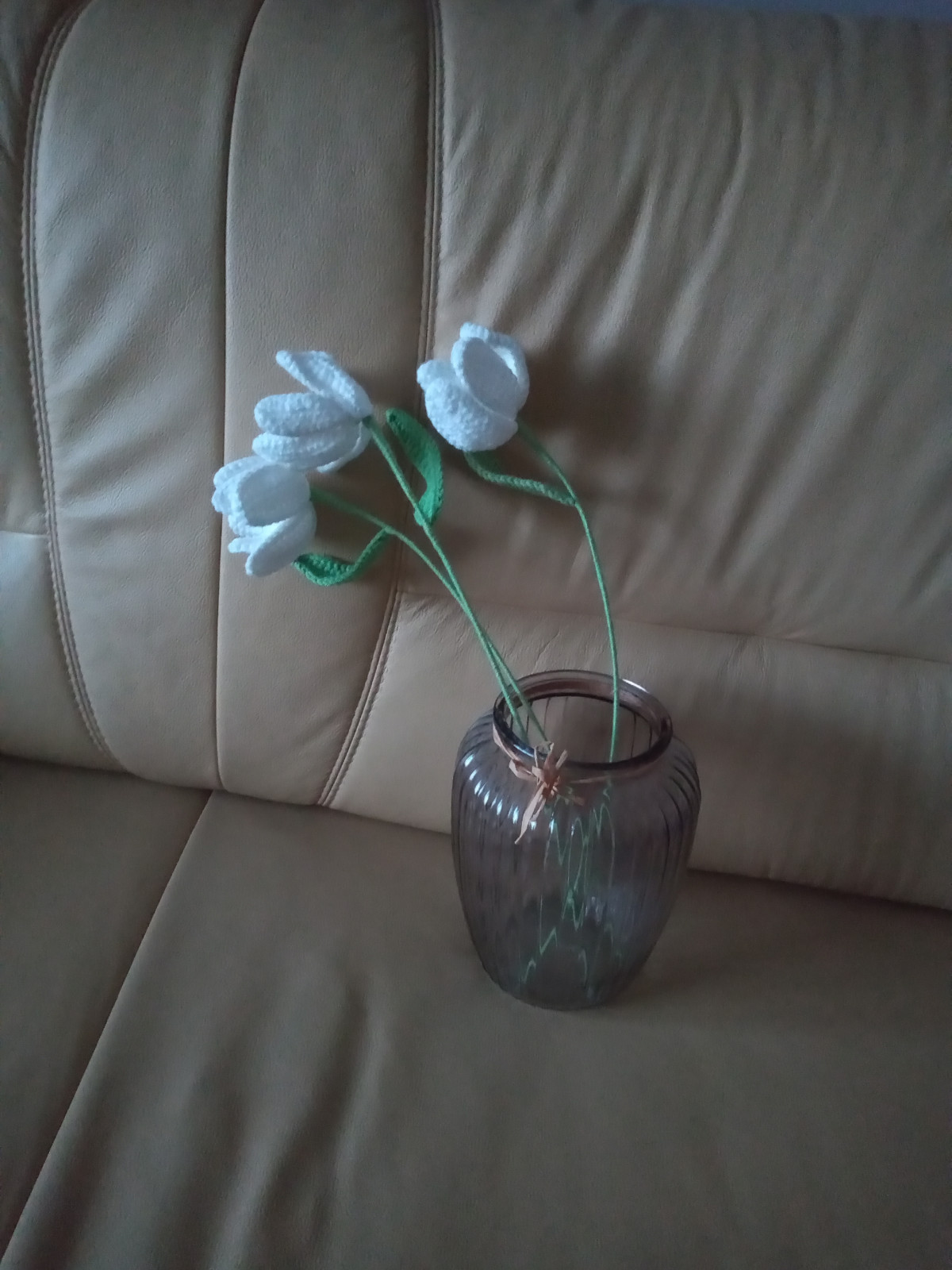 Tulipany wiosenne na szydełku białe z listkiem wysokie 42 cm 3 sztuki