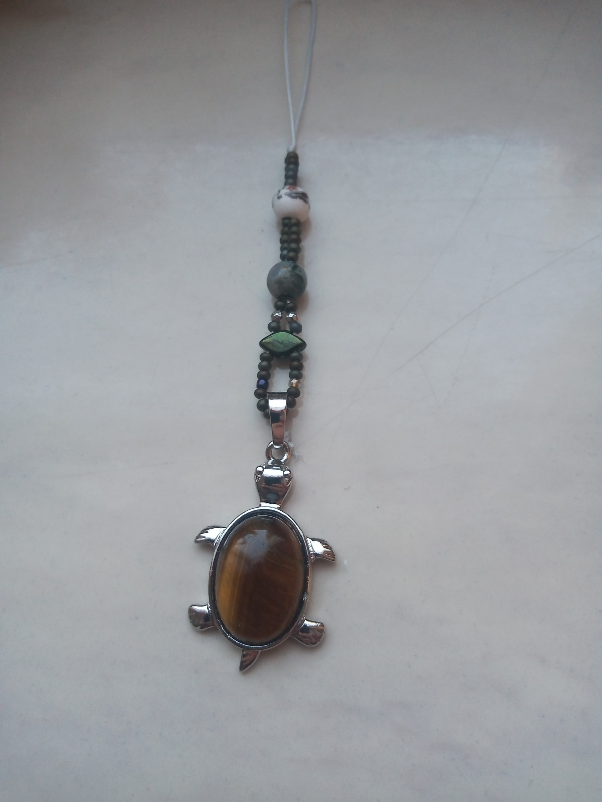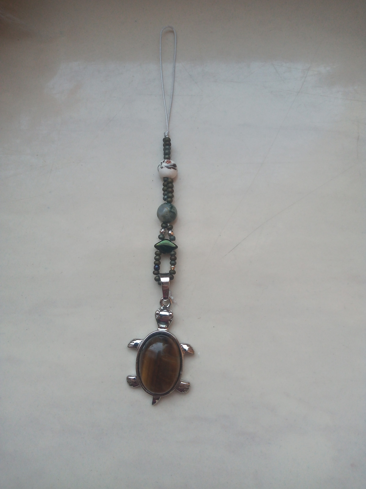 Breloczek do kluczy, torebki wykonany z matowych koralików w kolorze ziemi, ceramicznego koralika oraz zawieszki z kamienia naturalnego w kształcie żółwia o długości 2 cm.