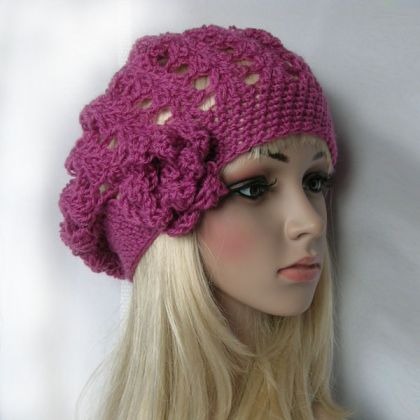 Ażurowy beret w kolorze zgaszonego różu wykonany na szydełku z włóczki akrylowej.