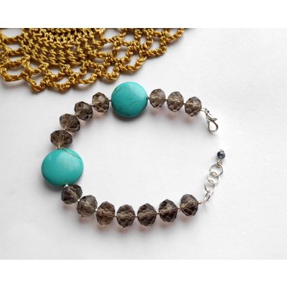 Prześliczna bransoletka wykonana z dysków naturalnego turkusu przeplatanych szlifowanymi oponkami w kolorze szarym.