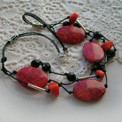 Efektowny naszyjnik wykonany z owalnych plastrów koralowca o wymiarach 2,5 x 3,5 cm, fasetowanych kuleczek onyksu o wielkości 10 mm, bryłek marmuru oraz woskowanego, czarnego sznurka.