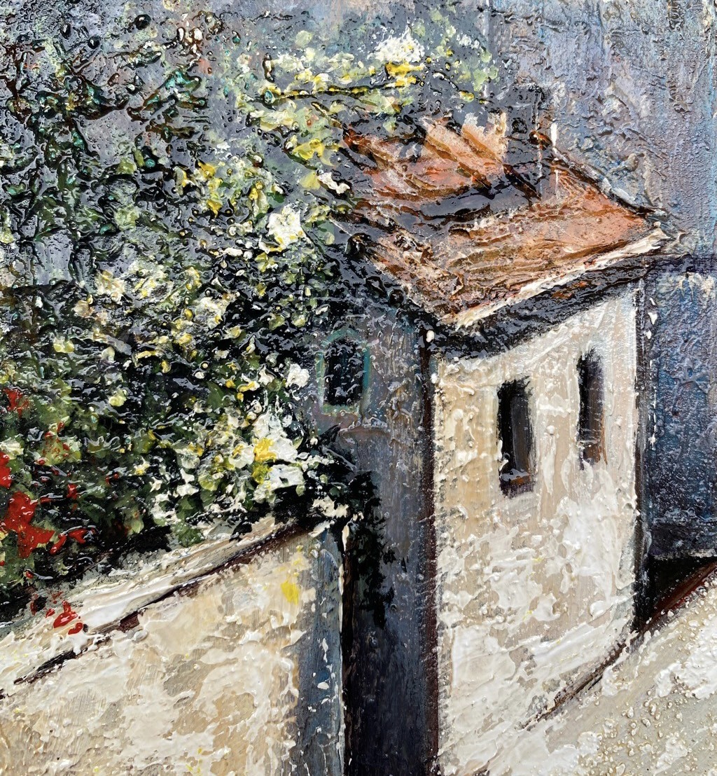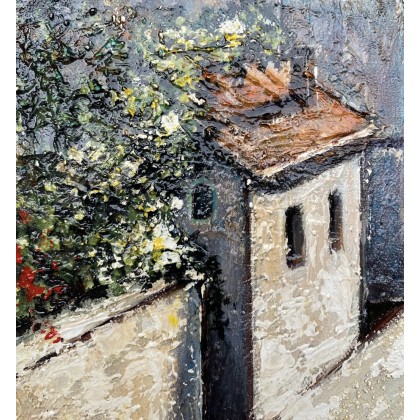 Prezentowany akrylowy obraz słonecznej ulicy włoskiego miasteczka, rozmiar 40*30 cm, ręcznie malowany, strukturalny 3D, namalowany ekspresyjnie w bogatej, nasyconej kolorystyce. Jasny miejski pejzaż cieszy oko, przywołuje wspaniałe wspomnienia lub słodkie marzenia.
