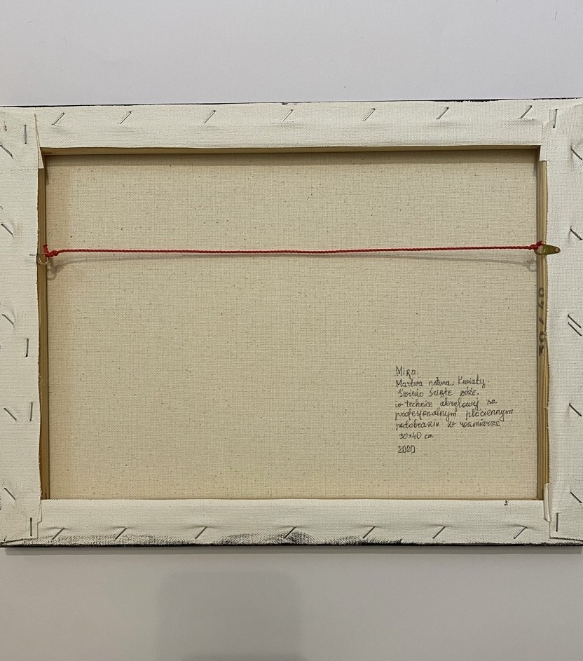 Obraz namalowany na bawełnianym płótnie o doskonałej jakości. Boki zamalowane w kolorze tła, a z tyłu doczepiona jest zawieszka, zatem można go powiesić bez potrzeby zakupu ramy - obraz gotowy do zawieszenia. Zawerniksowany. Sygnatura autorska znajduje się na awersie i rewersie.