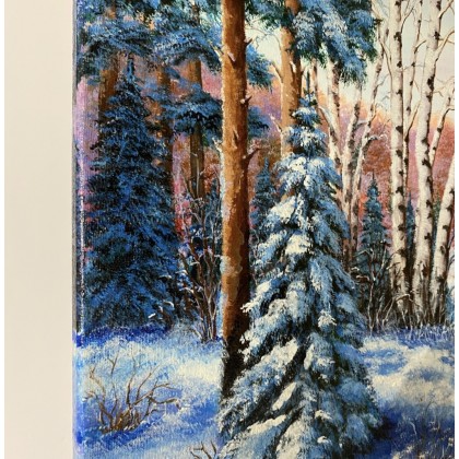 Prezentowany akrylowy obraz słonecznego dnia na skraju lasu pokrytym pierwszym śniegiem, rozmiar 40*60 cm, ręcznie malowany. Obraz jest namalowany realistycznie w bogatej, nasyconej kolorystyce. Ciekawa leśna kompozycja przedstawiająca drzewa, krzewy, suchą trawę posypaną pierwszym puszystym śniegiem przywołuje na myśl przeczucie rozpoczęcia baśniowych wakacji.