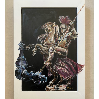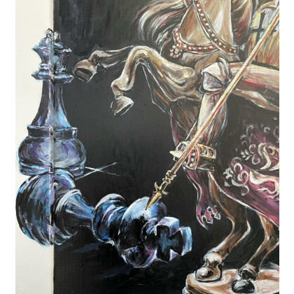 Prezentowany oryginalny, akrylowy obraz fantastycznej fabuły z figurami szachowymi i średniowiecznym rycerzem na białym koniu, który w fantastyczny sposób przekształcił się z figury szachowej konia. Obraz z motywem szachowym malowany ręcznie na drewnie. Rozmiar obrazu, łącznie z ramą, która stanowi integralną część obrazu, wynosi 46,8 cm na 33,6 cm. Scena zwycięskiej bitwy przedstawiona jest na czarnym tle, a masywna rama obrazu jest biała. Ozdobna rama obrazu w 100% naturalna, wykonana z drzewa sosnowego, ręcznie robioną.