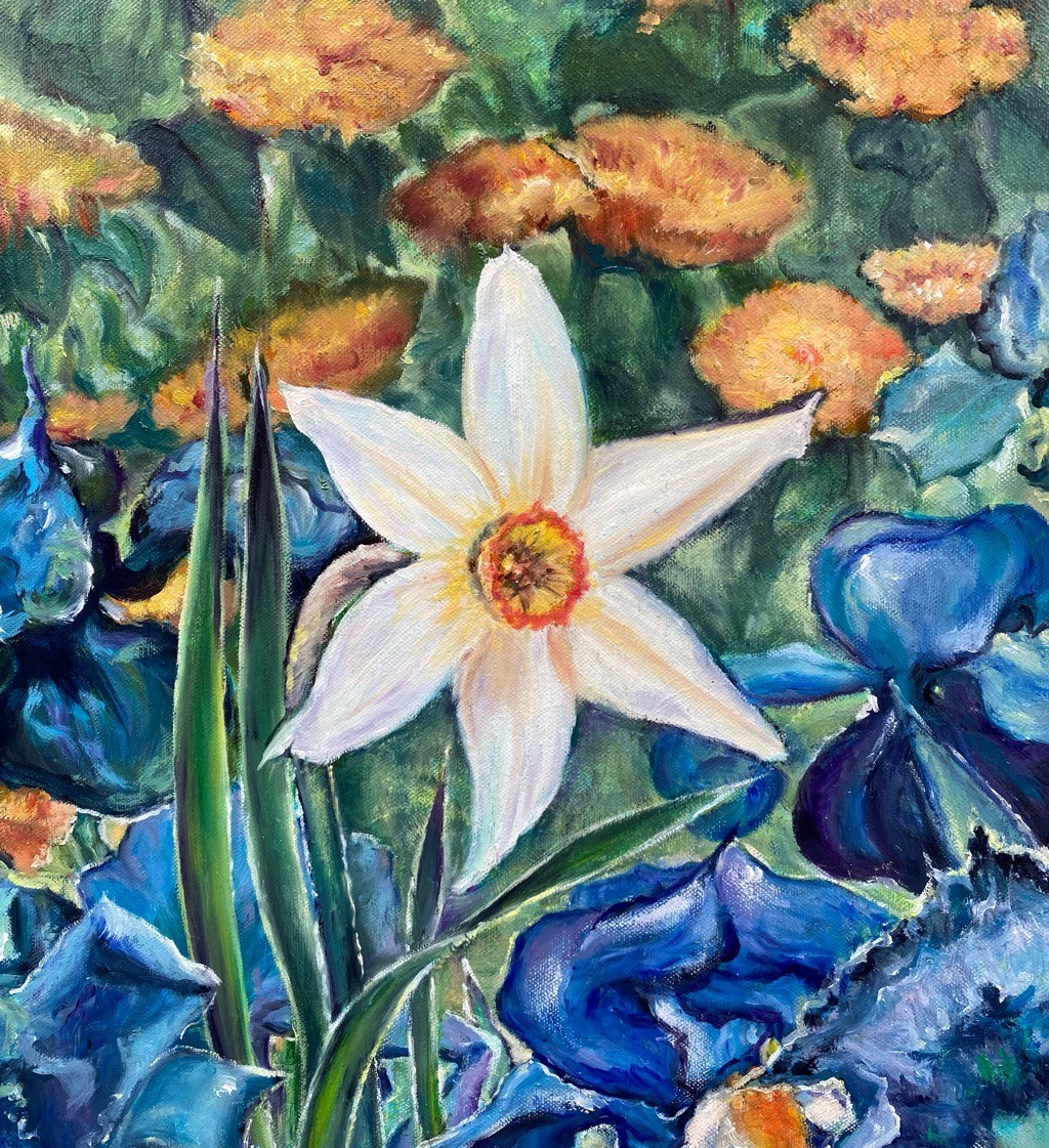 Prezentowany bardzo duży nowoczesny obraz olejny z motywem kwiatowym, rozmiar 100*130 cm, ręcznie malowany. Przed nami duży dywan kwiatowy z irysami, narcyzami, nagietkami i innymi roślinami. Nie ma horyzontu ani nieba, są tylko kwiaty i trochę ziemi. Uwaga tylko na kwiaty. Tak Van Gogh wymyślił jak malować obraz, tak malowali też japońscy mistrzowie, tak ja przedstawiłam irysy z narcyzem. Realizm i pointylizm ? te dwie techniki połączył Van Gogh i ja też je połączyłem. Van Gogh ma biały kwiat irysa na tle błękitu i fioletu, a ja namalowałem na tym tle biały kwiat narcyza, aby podkreślić różnorodność formy, koloru i charakteru natury.