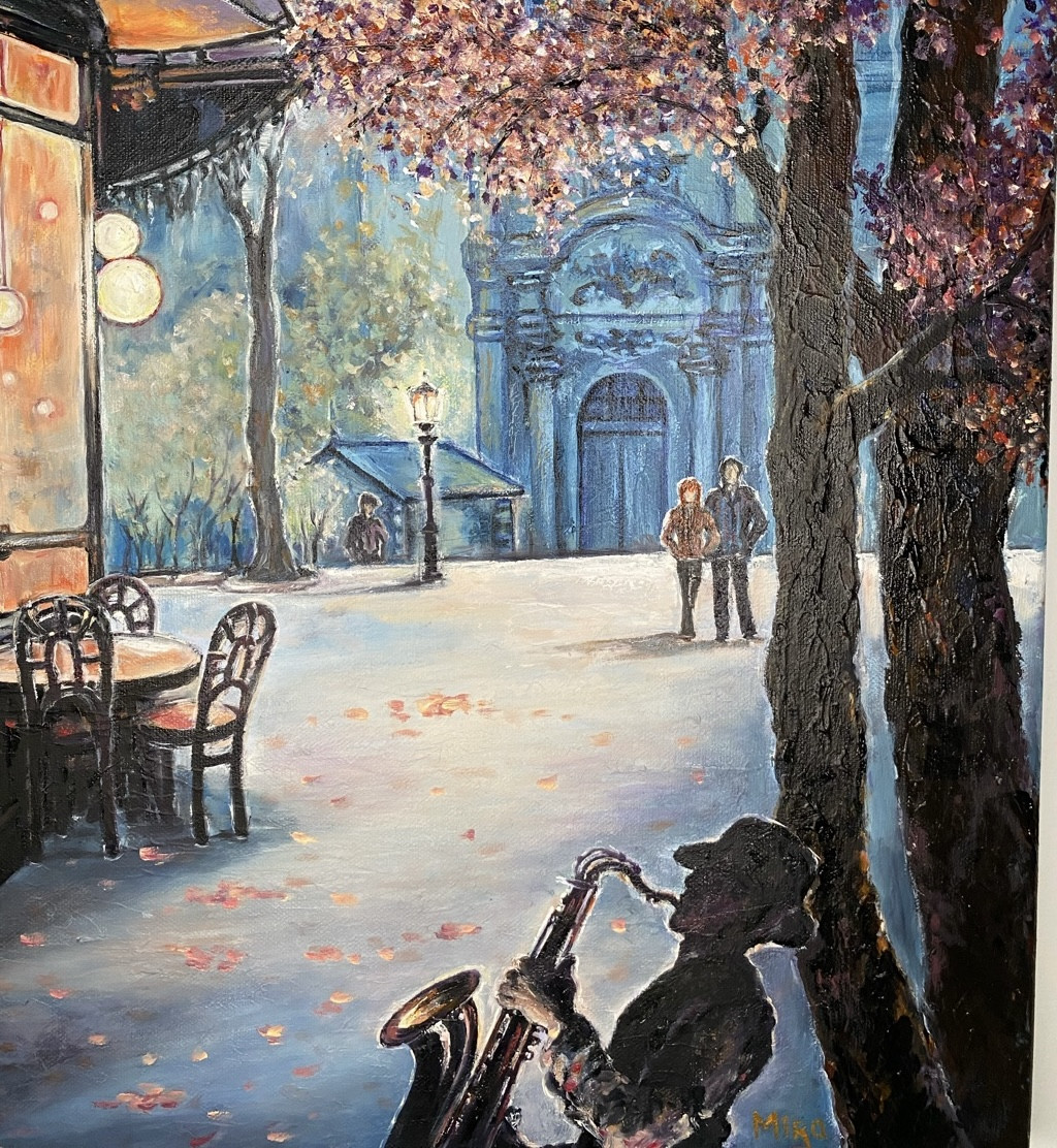 Jesienny krajobraz z saksofonistą wieczorem namalowany w stylu impresjonistycznym, oddaje atmosferę relaksu i marzycielskiego, romantycznego nastroju. To jedyne w swoim rodzaju dzieło sztuki.
