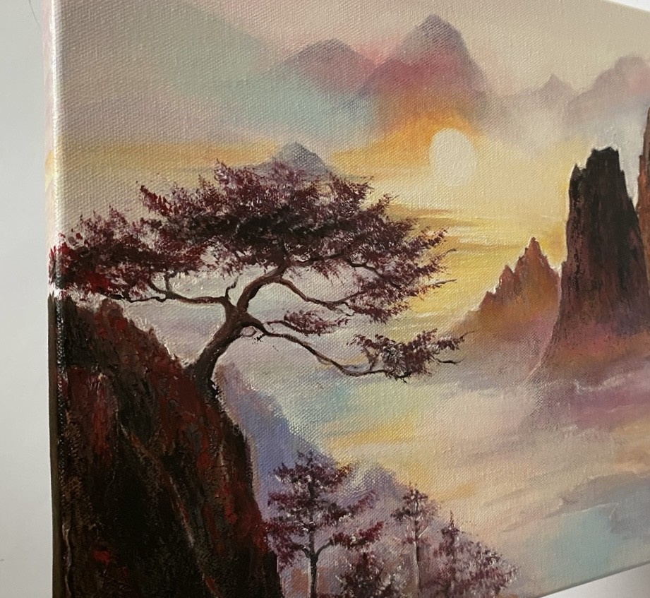 Prezentowany oryginalny, nowoczesny, olejny obraz zachodu słońca w górach, rozmiar 30*40 cm, ręcznie malowany. Góry w wieczornej mgle pomalowane na różne kolory przez promienie słońca chowające się za horyzontem jest namalowany realistycznie, minimalistycznie i w stylu japońskich mistrzów. To jedyne w swoim rodzaju dzieło sztuki.
