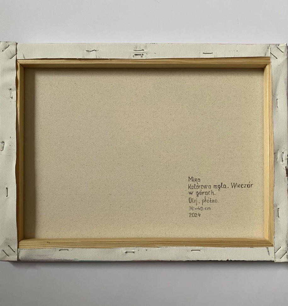 Obraz namalowany na bawełnianym płótnie o doskonałej jakości. Boki zamalowane w kolorze tła, a z tyłu doczepiona jest zawieszka, zatem można go powiesić bez potrzeby zakupu ramy - obraz gotowy do zawieszenia. Zawerniksowany. Sygnatura autorska znajduje się na awersie i rewersie.
