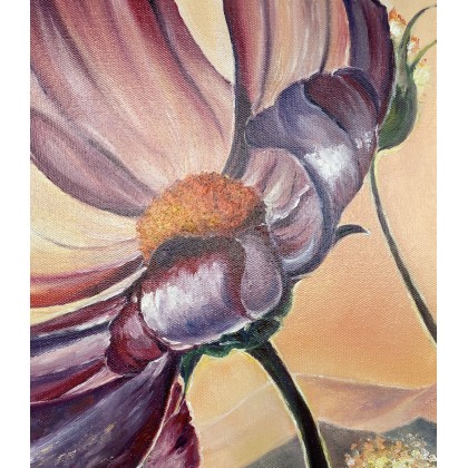 Prezentowany olejny obraz bajecznie pięknego wieczornego krajobrazu z kwiatami, rozmiar 60*40 cm, ręcznie malowany, strukturalny 3D, namalowany ekspresyjnie w bogatej, nasyconej kolorystyce. Jasne, soczyste, ciepłe kolory ostatnich promieni słońca nad nad górami, polami, kwiecistymi łąkami tworzą niesamowity bajeczny krajobraz. Serdecznie polecam.