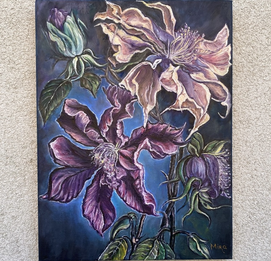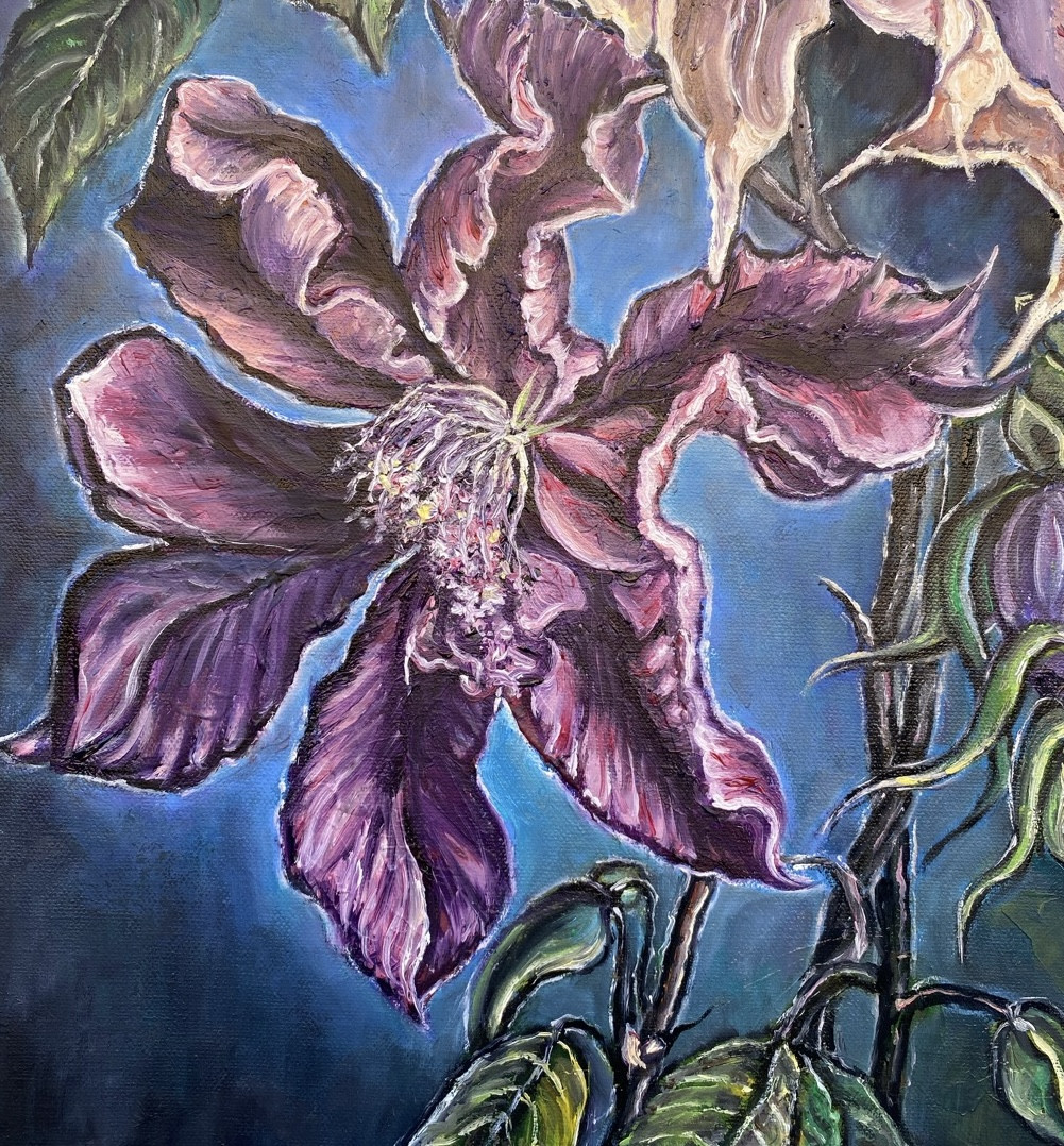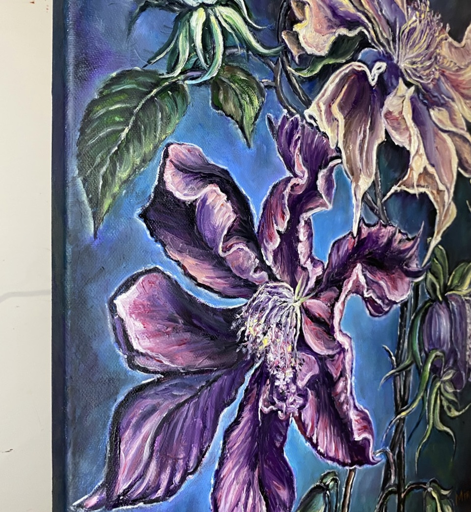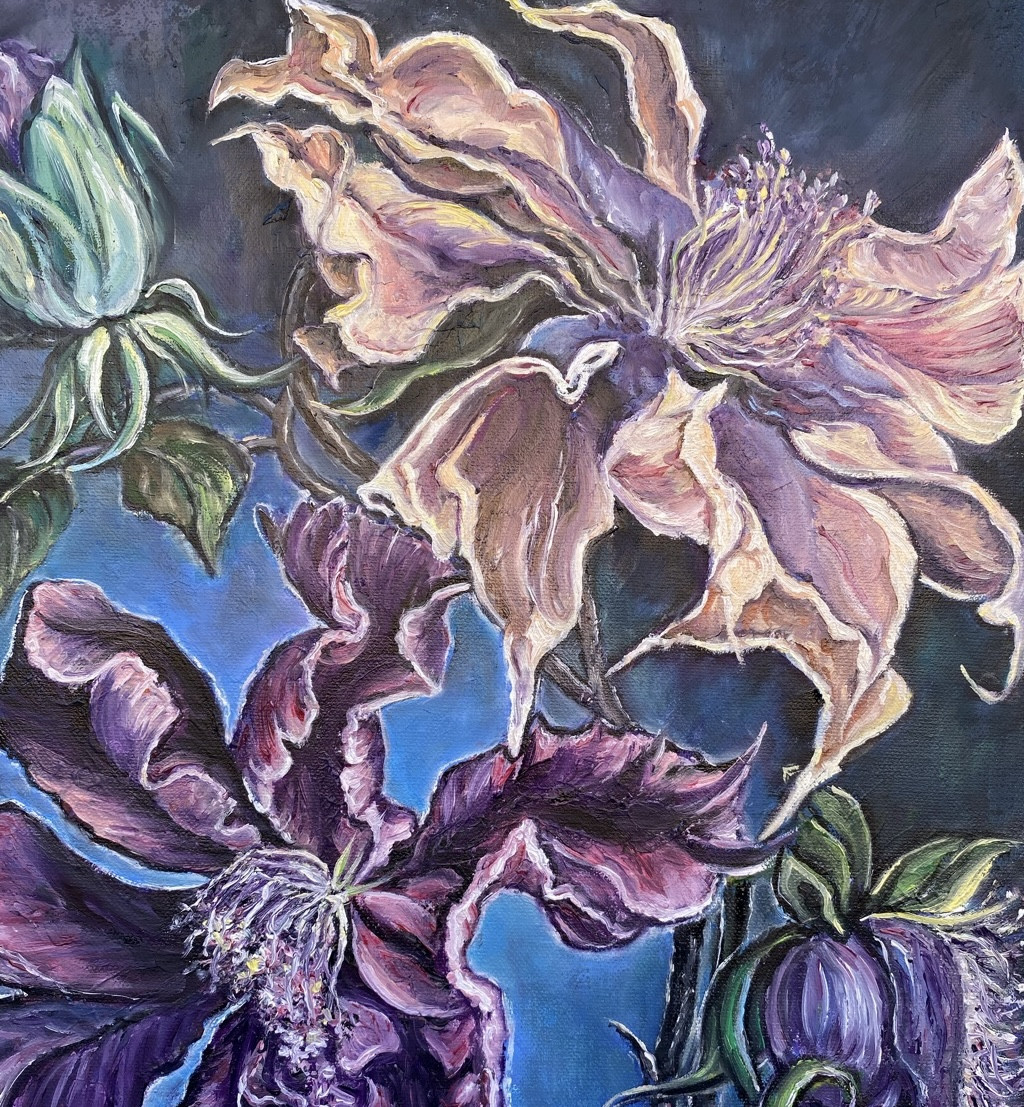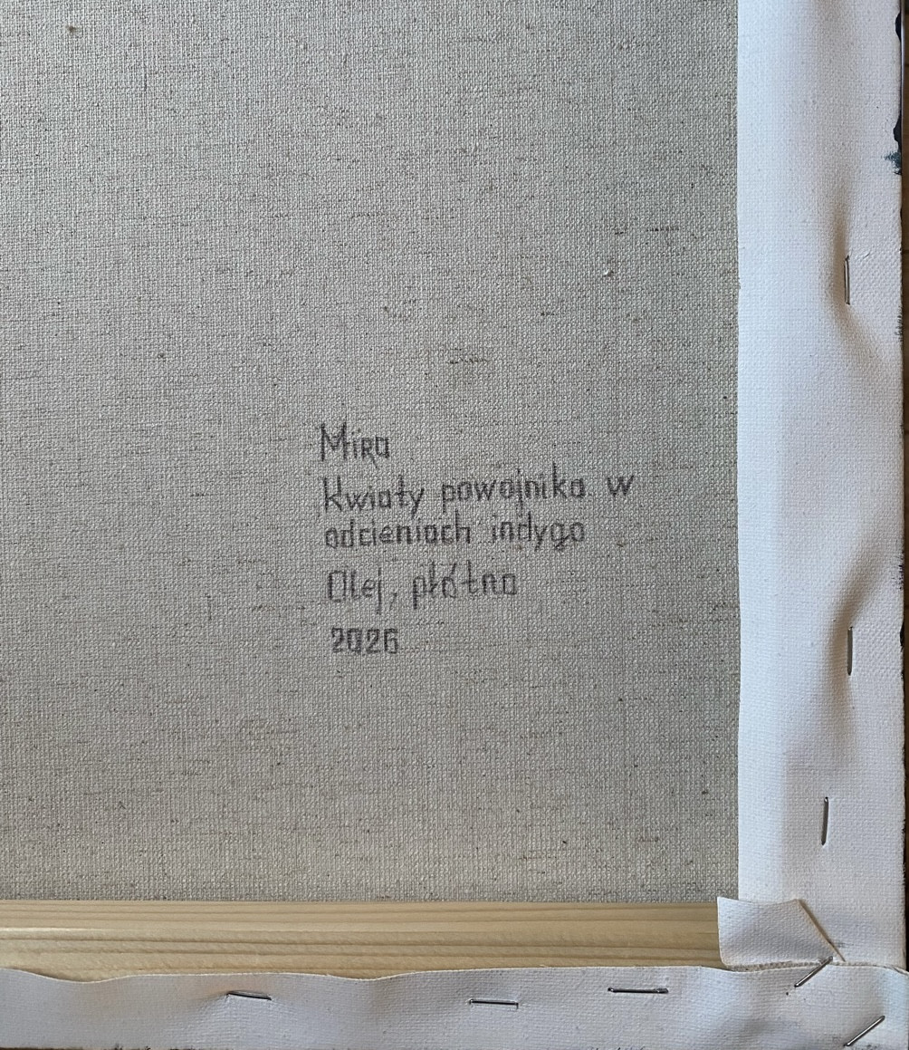 Przedstawiam obraz ”Kwiaty powojnika w odcieniach indygo” mojego autorstwa, namalowany profesjonalnymi farbami olejnymi Van Gogha produkowane przez holenderską firmę Royal Talens na bawełniano-lnianym płótnie o doskonałej jakości. Wymiary 40 x 30 cm (szerokość blejtramy: 2 cm). Piękne, eleganckie, efektowne kwiaty powojnika są realistycznie namalowane w odcieniach indygo na ciemnym tle.