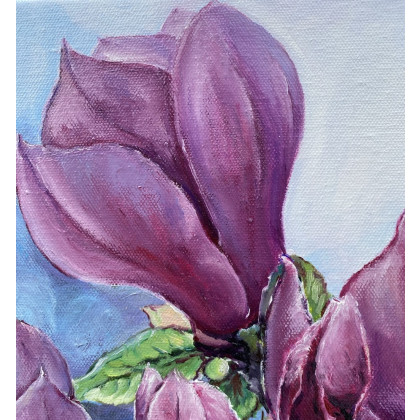 Prezentowany oryginalny, nowoczesny, olejny obraz pięknych dużych kwiatów wspaniałego drzewa magnolii , rozmiar 40*30 cm, ręcznie malowany. Cudowne bordowe kwiaty - zwiastuny wiosny narysowane są realistycznie. To jedyne w swoim rodzaju dzieło sztuki.