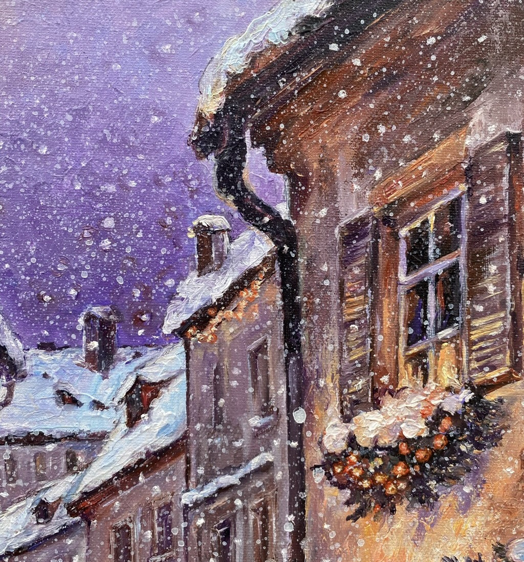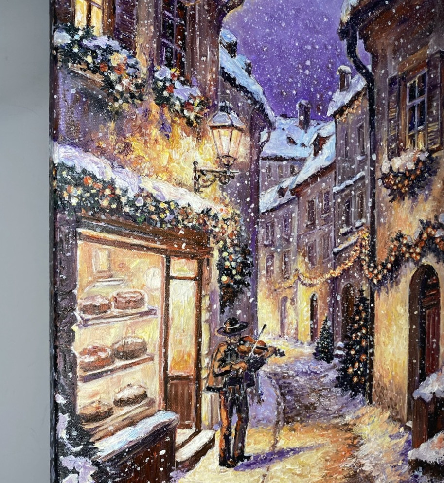Obraz miasta zimowym wieczorem w czasie świąt Bożego Narodzenia jest popularnym i inspirującym motywem i będzie idealnym dopełnieniem aranżacji w stylu klasycznym, rustykalnym i eklektycznym. Oryginalny pomysł na prezent. Serdecznie polecam.