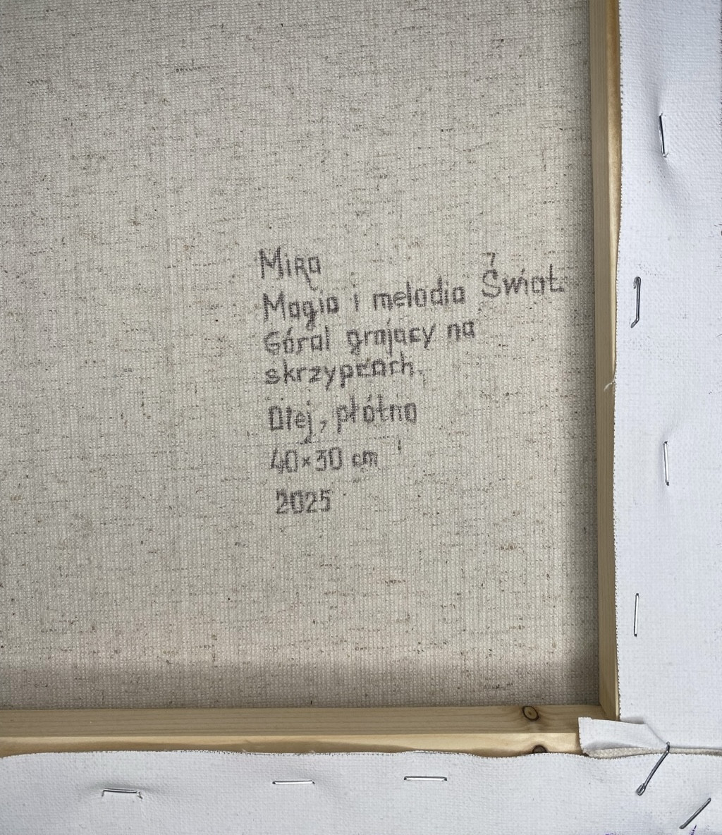 Oryginalny autorski obraz “Magia i melodia Świat. Góral grający na skrzypcach” namalowany ręcznie farbami olejnymi na bawełniano-lnianym płótnie o wymiarach 40x30 cm.