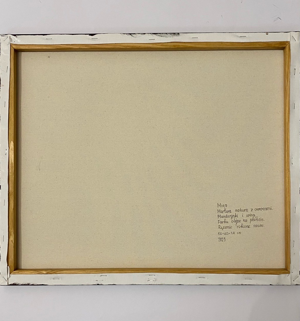 Prezentowany olejny obraz spektakularnego połączenia pięknego obrusu na stole, kosza z mandarynkami i winogronami oraz dwóch kieliszków wina tworzy świąteczny nastrój, rozmiar 50*60 cm, ręcznie malowany. Obraz jest namalowany realistycznie w bogatej, nasyconej kolorystyce.